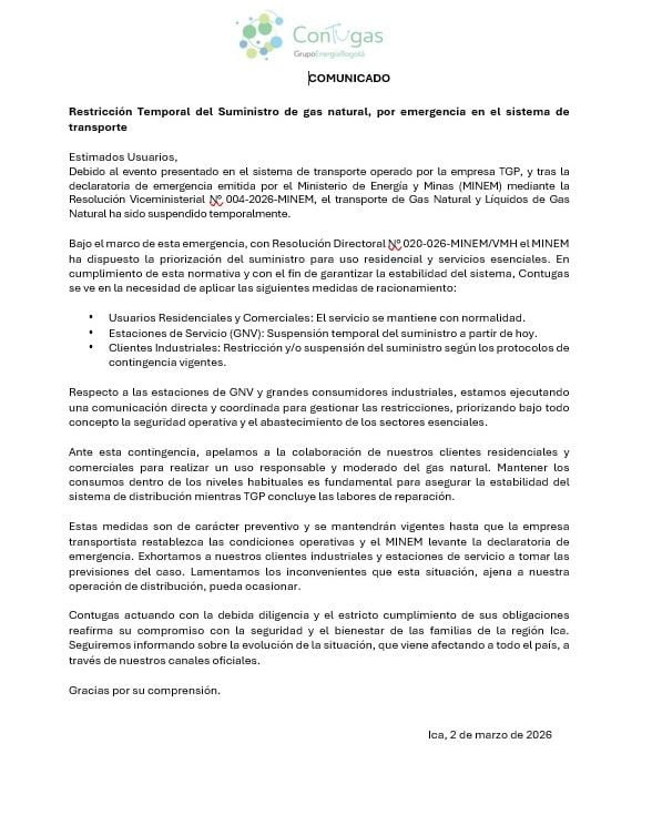 En Ica, la empresa distribuidora Contugas dispuso la suspensión del suministro a estaciones de GNV, mientras mantiene con normalidad el servicio residencial y comercial. La empresa exhortó a un uso responsable del recurso mientras se restablecen las condiciones operativas del sistema de transporte de gas natural, precisando que la situación es ajena a su operación directa.