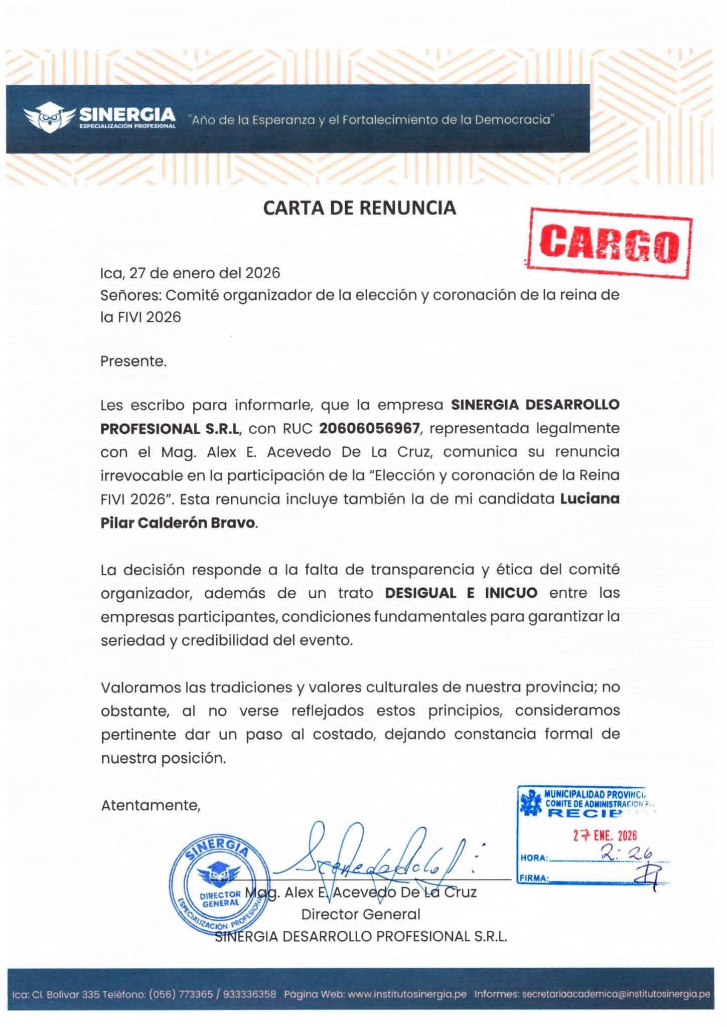 En el documento fechado el 27 de enero de 2026, Sinergia Desarrollo Profesional S.R.L., representada legalmente por el Mag. Alex E. Acevedo De La Cruz, anunció su salida definitiva del concurso y la de su candidata Luciana Pilar Calderón Bravo. En la carta, la empresa cuestiona duramente la conducción del certamen.