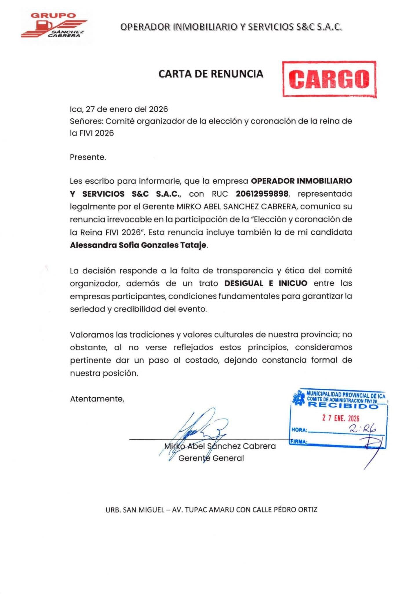 En la misma fecha, el Grupo Sánchez Cabrera, a través de la empresa Operador Inmobiliario y Servicios S&C S.A.C., también comunicó su renuncia irrevocable al Reinado FIVI 2026, retirando a su candidata Alessandra Sofía Gonzales Tataje. La carta, firmada por el gerente Mirko Abel Sánchez Cabrera, expone argumentos similares.