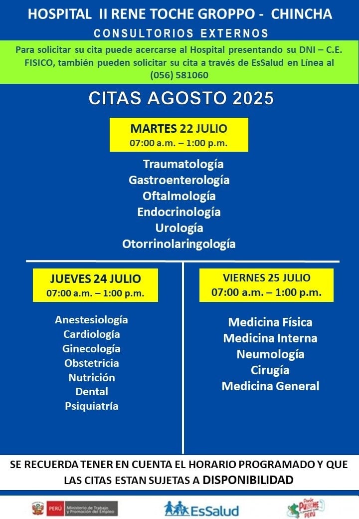 En el Hospital II René Toche Groppo de Chincha, por consultorios externos, hoy 24 de julio se otorgarán citas para anestesiología, cardiología, ginecología, obstetricia, nutrición, dental y psiquiatría. El viernes 25 de julio para medicina física, medicina interna, neumología, cirugía y medicina general.