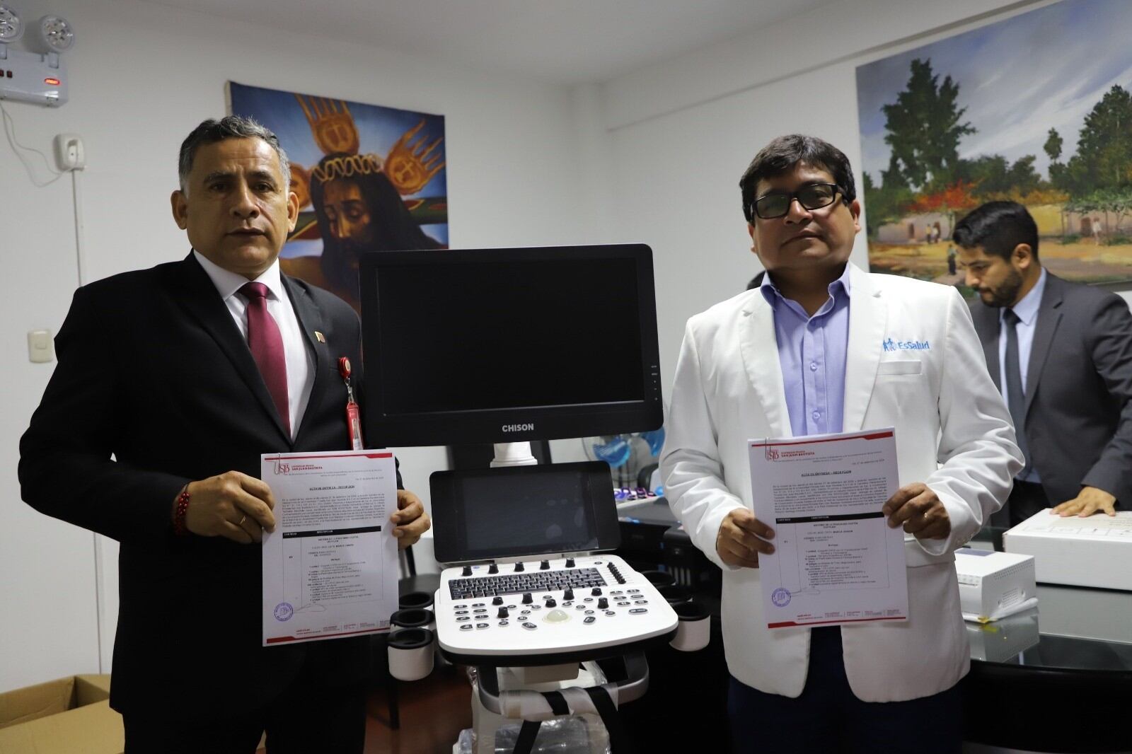 Durante el acto protocolar, el director general de la UPSJB, Dr. Alfredo Mendieta Leyva, entregó al Dr. Roberto Almeida Donaire, gerente de EsSalud Ica, un moderno equipo de Ecografía Doppler Color, el mismo que servirá para fortalecer el sistema de salud de la red Ica.