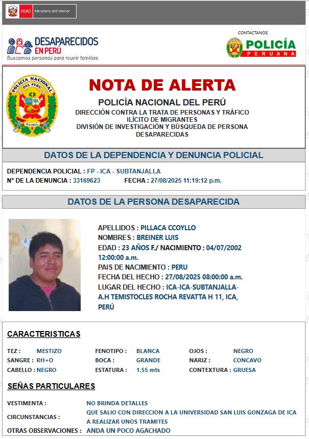 En el caso de Breiner, su hermano mayor relató que salió de su casa en Pueblo Joven Temístocles Rocha el pasado 23 de agosto rumbo a la Universidad Nacional San Luis Gonzaga de Ica para realizar trámites académicos y nunca volvió. Desde entonces no se sabe nada de él. “Estamos desesperados, mi madre está destrozada y pedimos que se difunda su foto para encontrarlo”, declaró Freddy Pillaca, cuestionando además la falta de resultados en el rastreo de cámaras y del GPS de su celular.