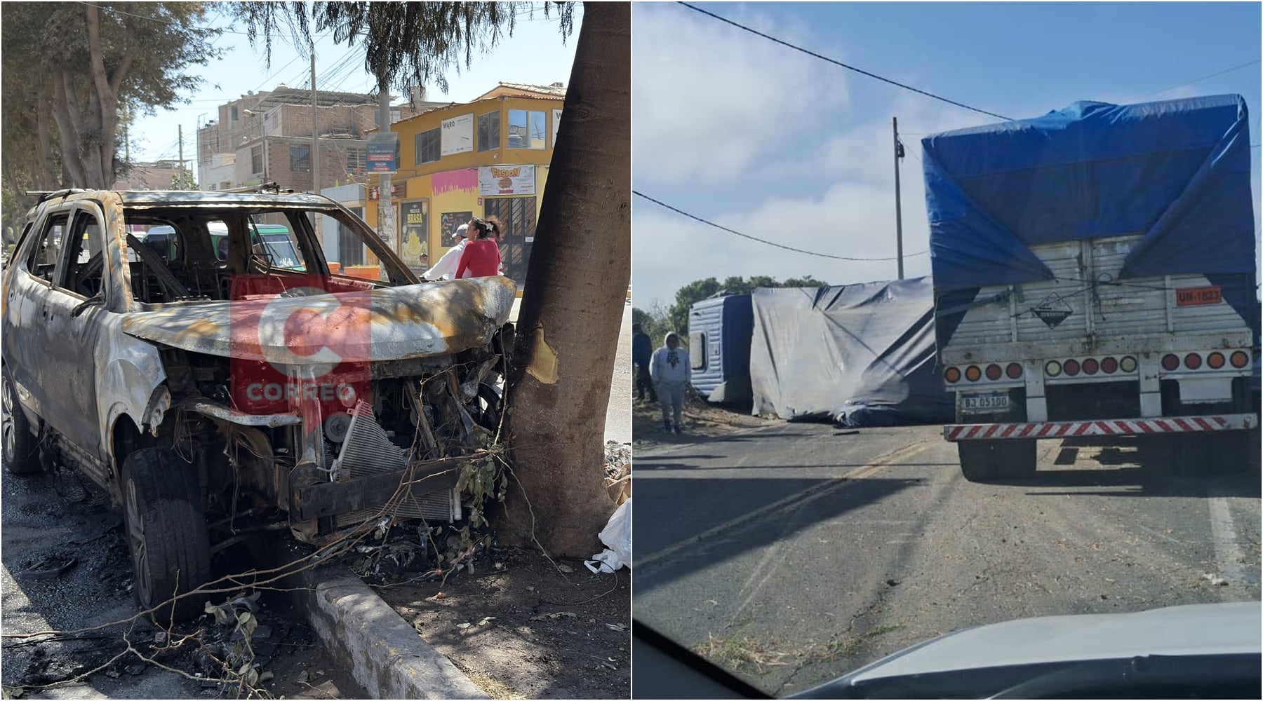 El primer accidente ocurrió en horas de la madrugada en la avenida San Martín, cuando una camioneta negra marca Changam, modelo CX70 y de placa BTP-652, terminó completamente calcinada tras estrellarse contra un árbol. De acuerdo con las investigaciones preliminares, el vehículo, perteneciente a Edwiin Cabezas, habría provocado previamente un triple choque y se dio a la fuga, antes de perder el control y terminar incendiado entre la calle Raúl Boza y la avenida San Martín.