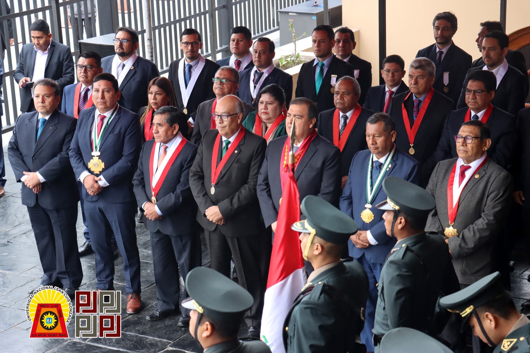 La celebración inició con el tradicional izamiento del Pabellón Nacional, seguido de la ceremonia protocolar en el auditorio de la Corte. El acto fue presidido por el Presidente (e) de la Corte Superior de Justicia de Ica, Dr. Tito Guido Gallegos Gallegos, quien agradeció la presencia de las autoridades regionales, como el gobernador, el alcalde provincial, vocales y jueces de la región.