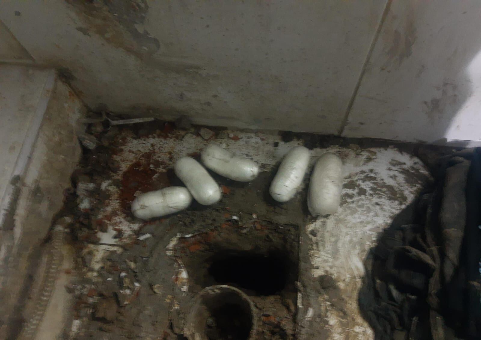 La policía confirmó el hallazgo de cinco paquetes, al parecer de droga (clorhidrato de cocaína), en el pabellón “H”, en el interior del baño número 1, cerca de la tubería del baño del establecimiento penal de Ica (expenal Cristo Rey Cachiche - Ica).