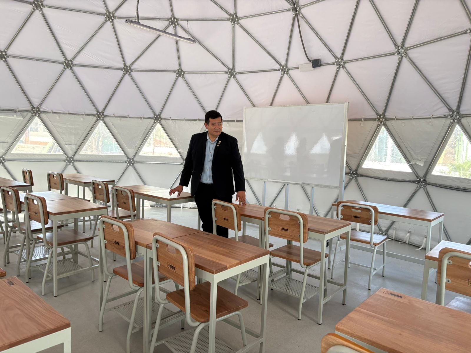 El director regional de educación de Ica, Mag. José Luis Huamán Orosco, en compañía de los jefes de línea, visitó la Institución Educativa Antonia Moreno de Cáceres, donde el Programa Nacional de Infraestructura Educativa (Pronied) del Ministerio de Educación instaló modernas aulas tipo domo.