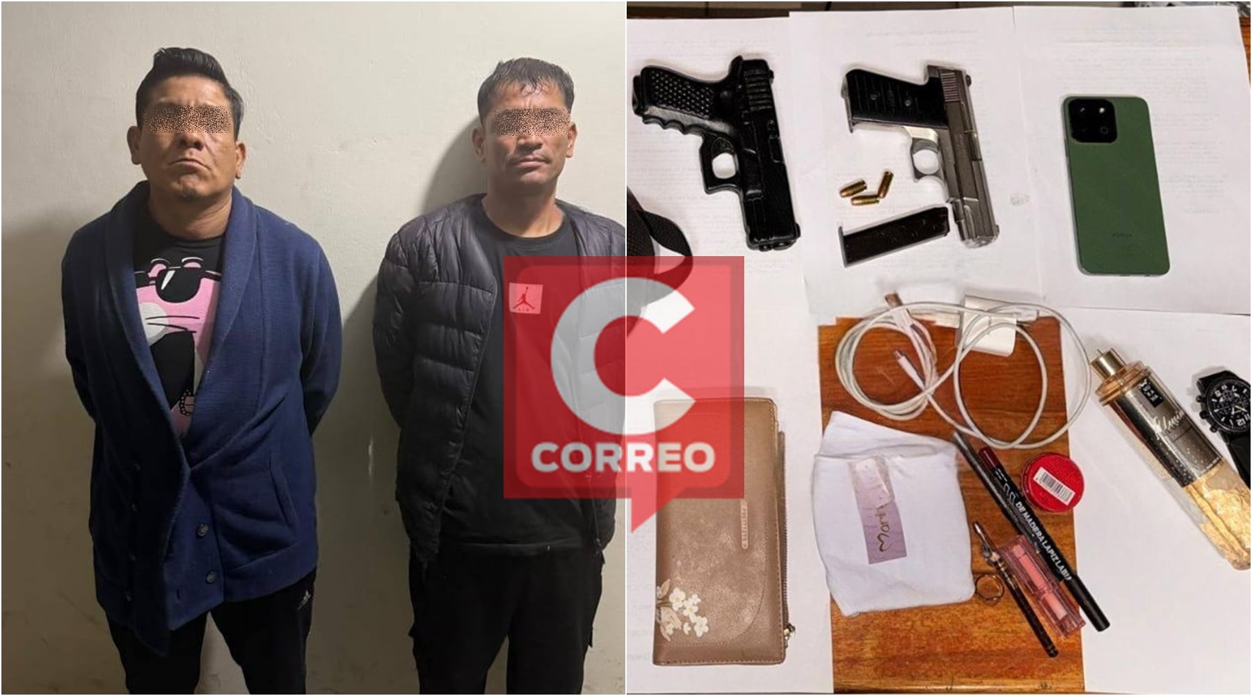 Durante la detención, personal del Área de Robos de la PNP halló en poder de los sujetos armas de fuego, municiones y diversos objetos personales, entre ellos una billetera de mujer, artículos varios y un moderno teléfono celular, que se presume fueron obtenidos mediante robos cometidos en diferentes puntos de la ciudad.