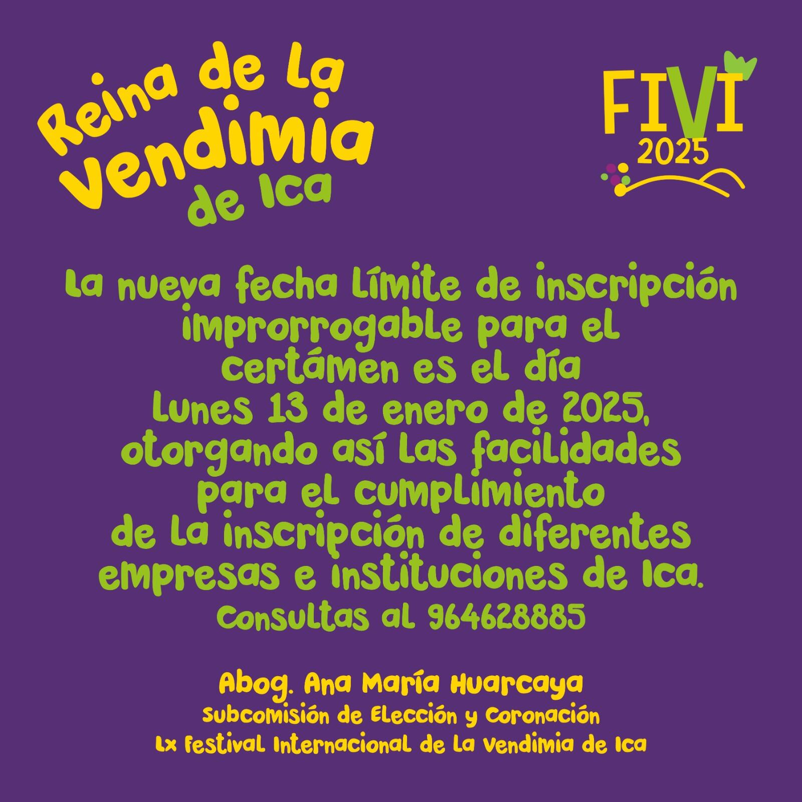 A través de la Subcomisión de Elección y Coronación FIVI 2025, presidido por la regidora Abog. Ana María Huarcaya, se precisó que la nueva fecha límite de inscripción, es el lunes 13 de enero de 2025 (fecha improrrogable). Esta extensión permite a empresas e instituciones de la región asegurar su participación en este gran evento.