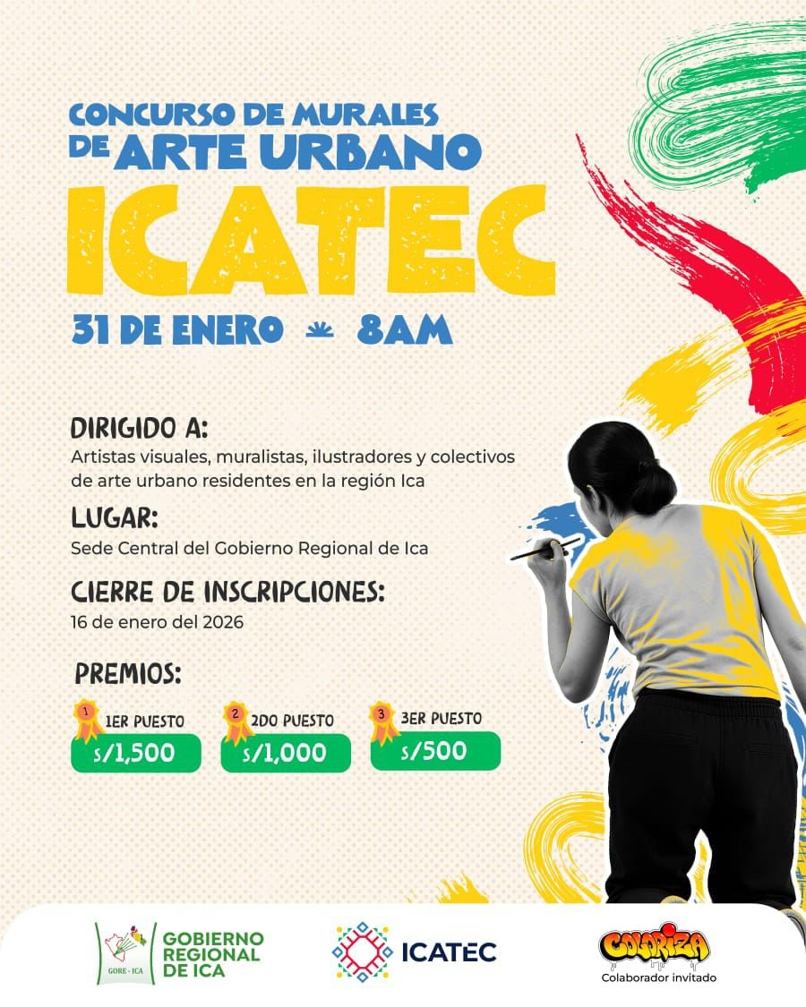 El Gobierno Regional de Ica lanzó el Concurso de Murales de Arte Urbano ICATEC, una iniciativa dirigida a artistas visuales, muralistas, ilustradores y colectivos de arte urbano de la región, con el objetivo de promover la creatividad y fortalecer la identidad cultural de Ica a través del arte en espacios públicos.