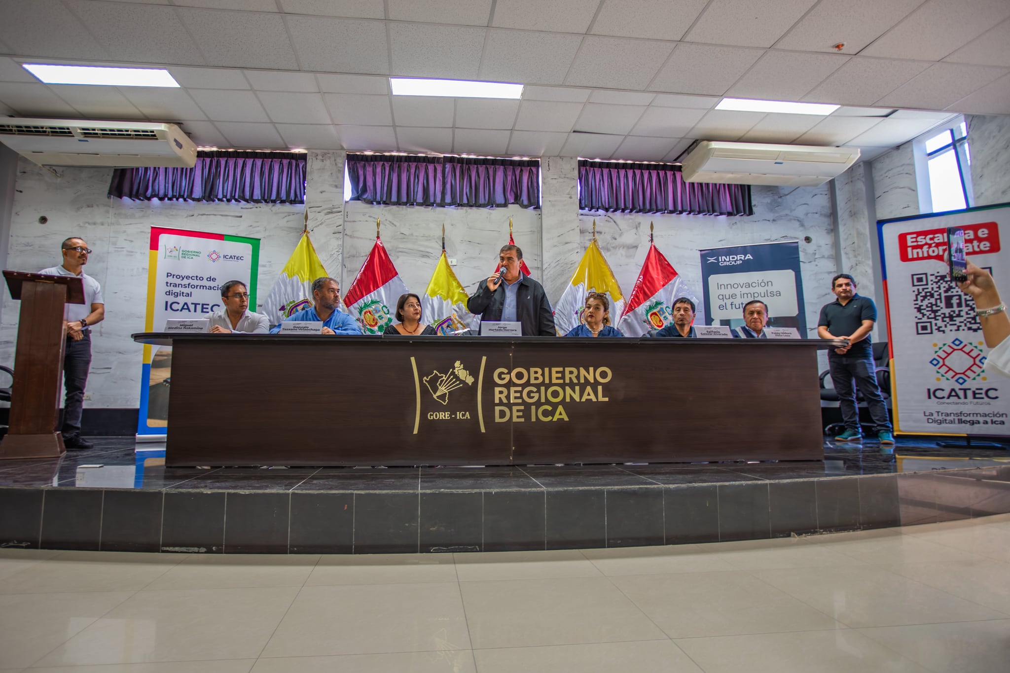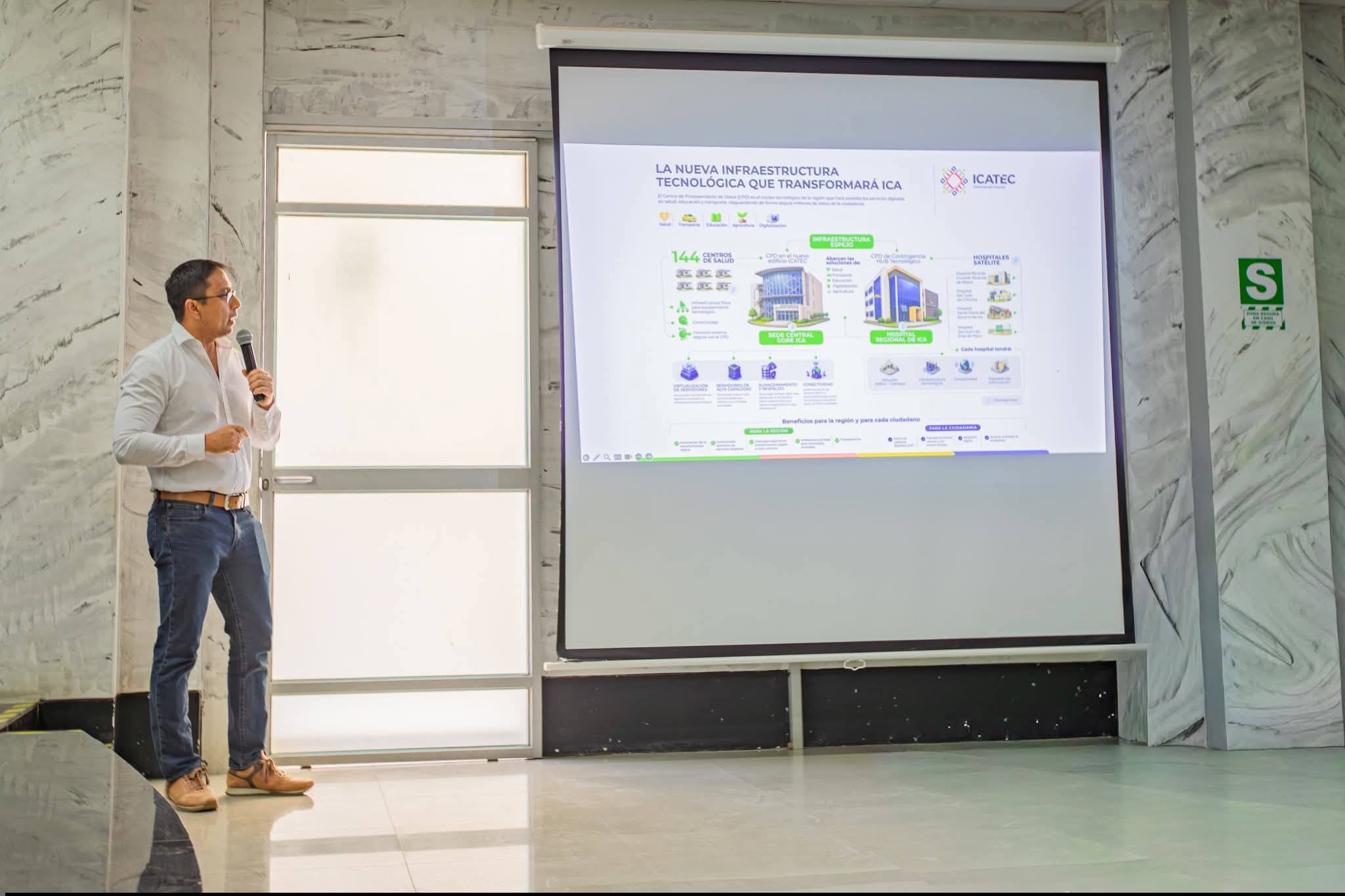 El Gobierno Regional de Ica presentó los avances del proyecto de transformación digital ICATEC, que también integra el denominado “Salud Responde”, como parte del nuevo Centro de Procesamiento de Datos, infraestructura que busca modernizar los servicios públicos en la región. La exposición se realizó en una conferencia de prensa en el auditorio de la Gobernación, con participación de autoridades regionales y representantes del consorcio encargado del proyecto.