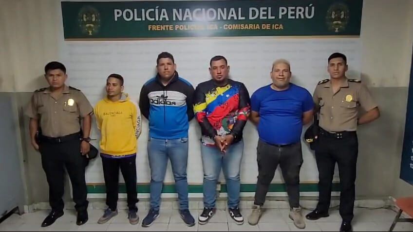 En una certera operación policial, efectivos de la comisaría PNP- Ica, realizaron detenciones en la calle Lima y Huánuco Ica, dentro de los términos de la flagrancia de delito, lograron detener a Pedro Andrés Acosta Silva de 23 años, Luis Ángel Megia Ledesma (27), Luis Antonio Leal Mieres (28) e Ismael Antonio Benavides (30), todos de nacionalidad venezolana, y quienes serían integrantes de la banda criminal “Los Gallinazos de Cachiche”.