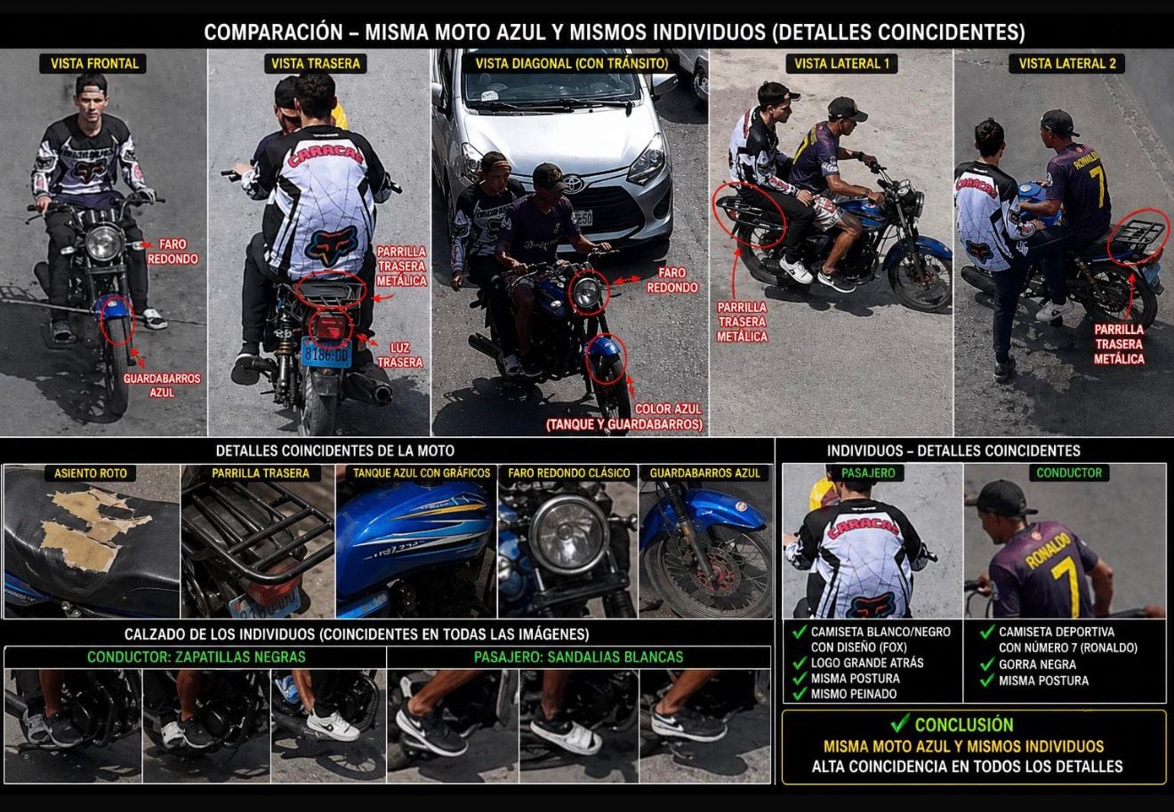 En ese proceso, se logró identificar de manera reiterada una motocicleta de color azul con dos ocupantes, cuya presencia coincidía en múltiples grabaciones. A partir de ello, los investigadores realizaron un análisis comparativo detallado utilizando diversas perspectivas: vistas frontales, posteriores, laterales y diagonales, incluso en escenas con tránsito vehicular.