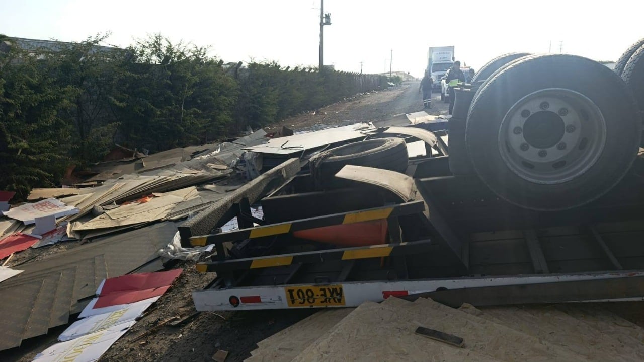 El hecho ocurrió frente al fundo Safco, donde un camión de placa AXE-861, que transportaba planchas de madera, se despistó y terminó volcado sobre la vía.