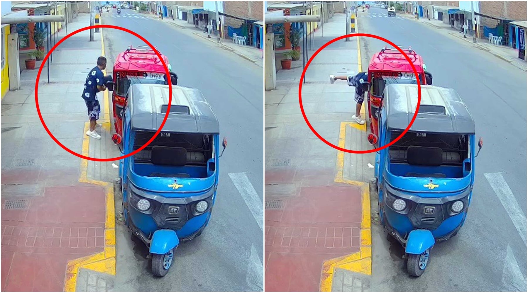 La grabación muestra al facineroso distanciarse de su familia, y al notar que nadie lo veía por la ventana del asiento posterior del mototaxi mete su cuerpo para sacar el piso, no conforme hace lo mismo en el lado del conductor. Después huye llevándose los accesorios.