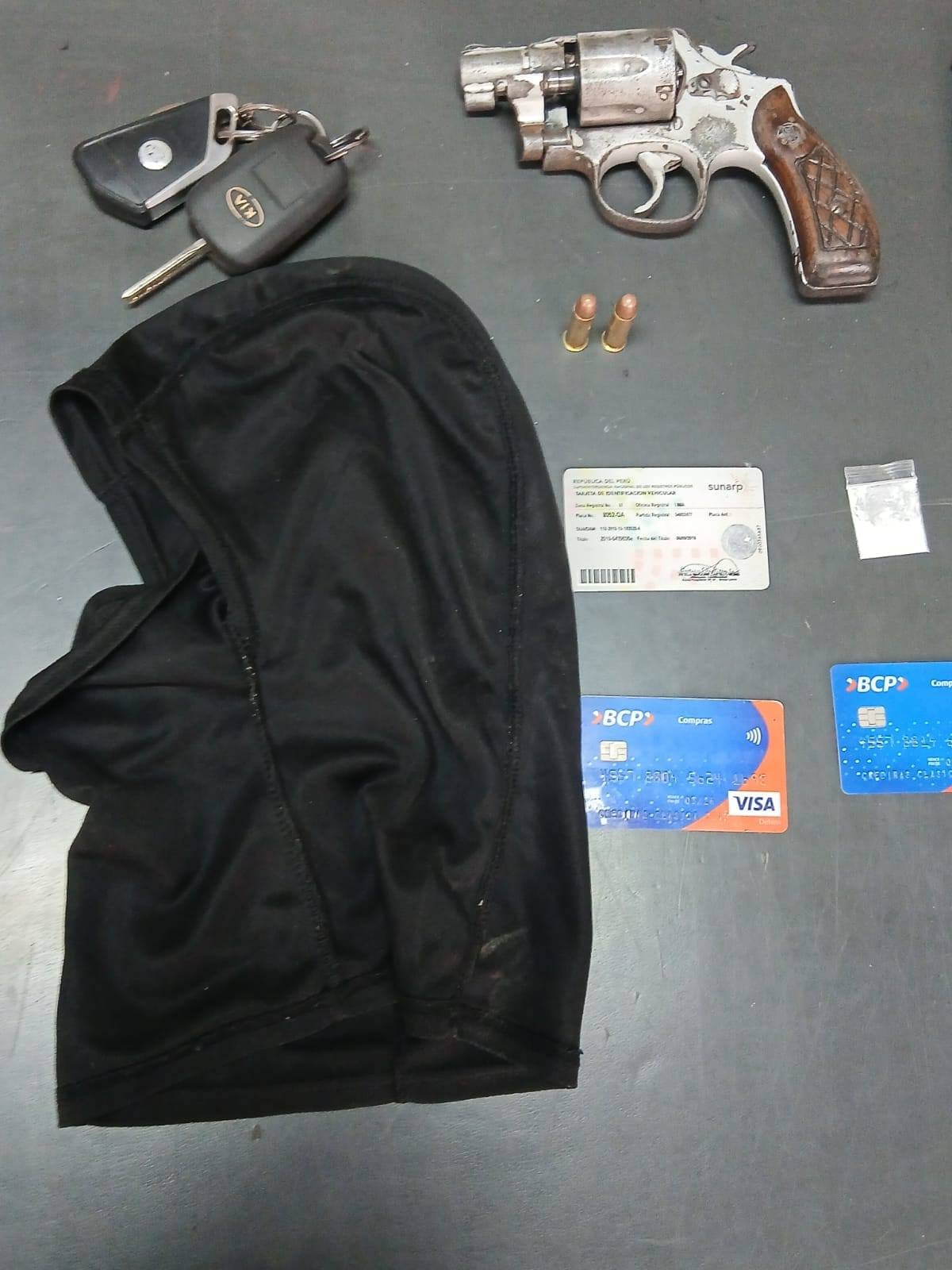 Durante el registro vehicular, bajo el asiento del conductor se halló: un revólver Smith & Wesson, dos municiones calibre .38 SPL, un pasamontañas color negro y teléfonos celulares