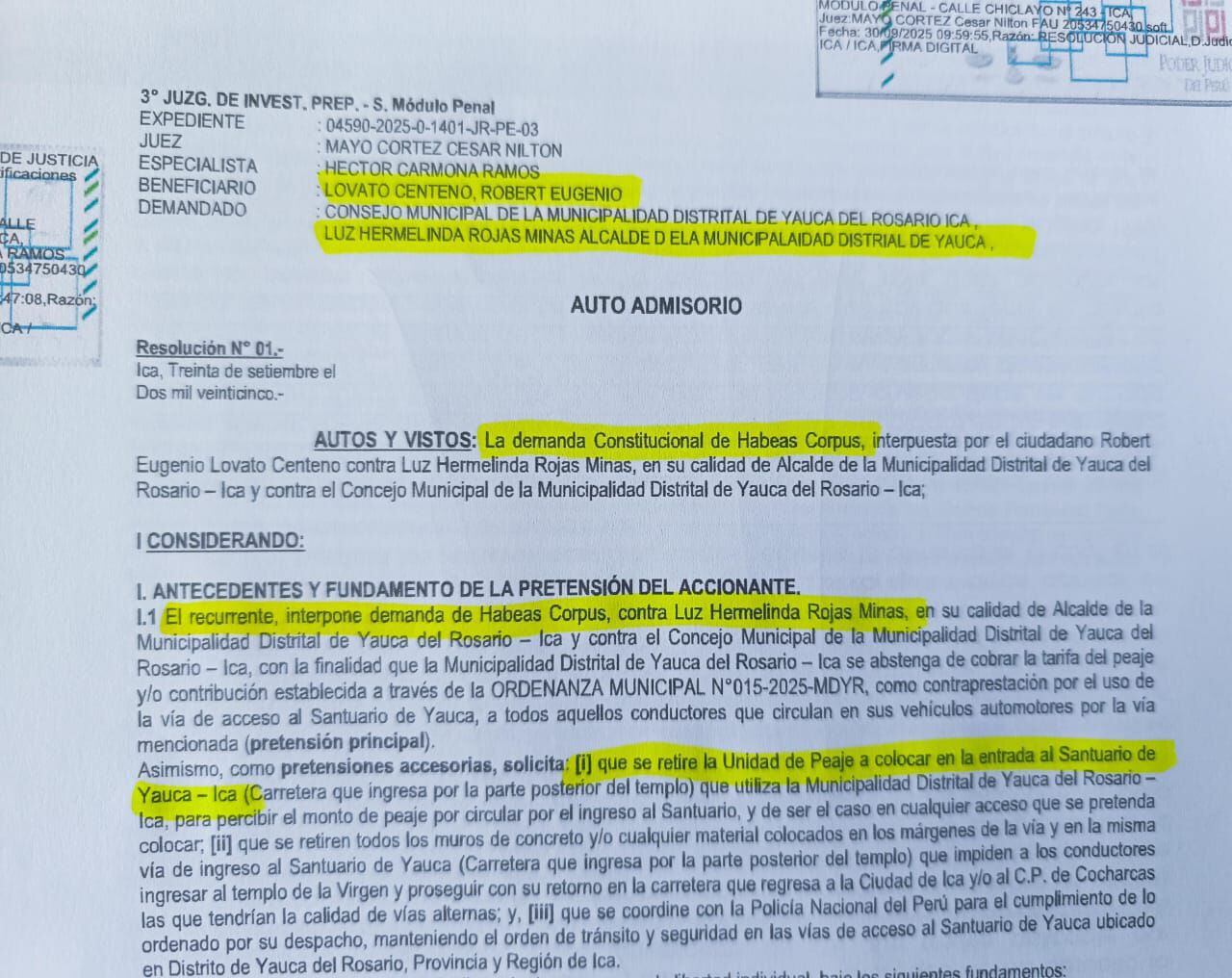 El caso ha sido admitido a trámite por el Tercer Juzgado de Investigación Preparatoria del Módulo Penal de Ica, bajo el expediente N.° 04590-2025-0-1401-JR-PE-03, y será evaluado por el juez César Nilton Mayo Cortez.