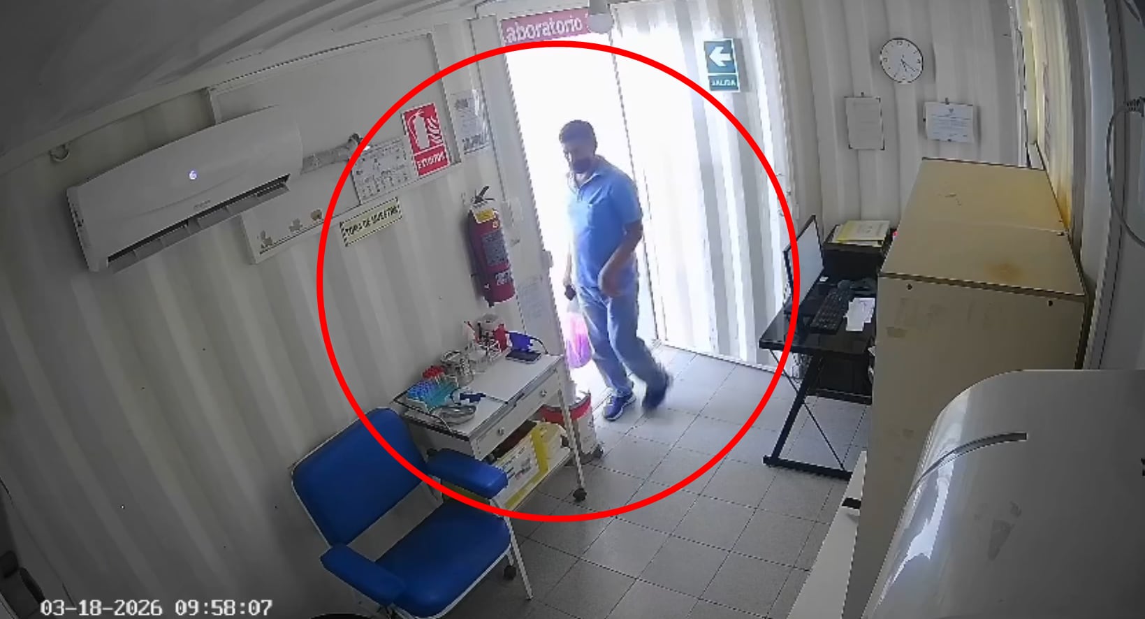 El delito ocurrió alrededor de las 9:58 a.m., cuando el individuo ingresó al recinto haciéndose pasar por un usuario del servicio de salud. De acuerdo con las imágenes de vigilancia, el sujeto vestía una mascarilla negra y aparentaba hablar por teléfono mientras se desplazaba por el área de atención.