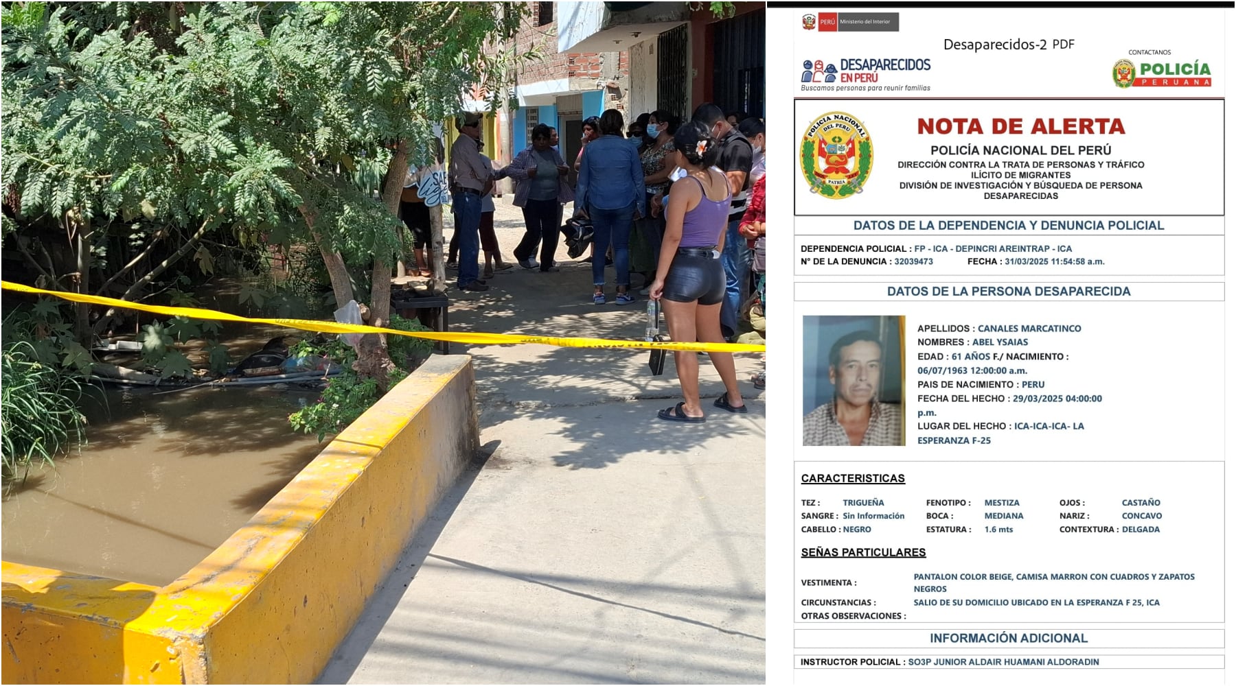 El pasado sábado 29 de marzo, se registró la desaparición del ciudadano Abel Ysaias Canales Marcatinco de 61 años, quien salió de su domicilio ubicado en el pueblo joven La Nueva Esperanza, en al provincia de Ica, con rumbo desconocido. Tras 11 días, su búsqueda ha terminado de la manera más trágica que se esperaba, ya que su cuerpo fue encontrado sin vida en el interior de una acequia.