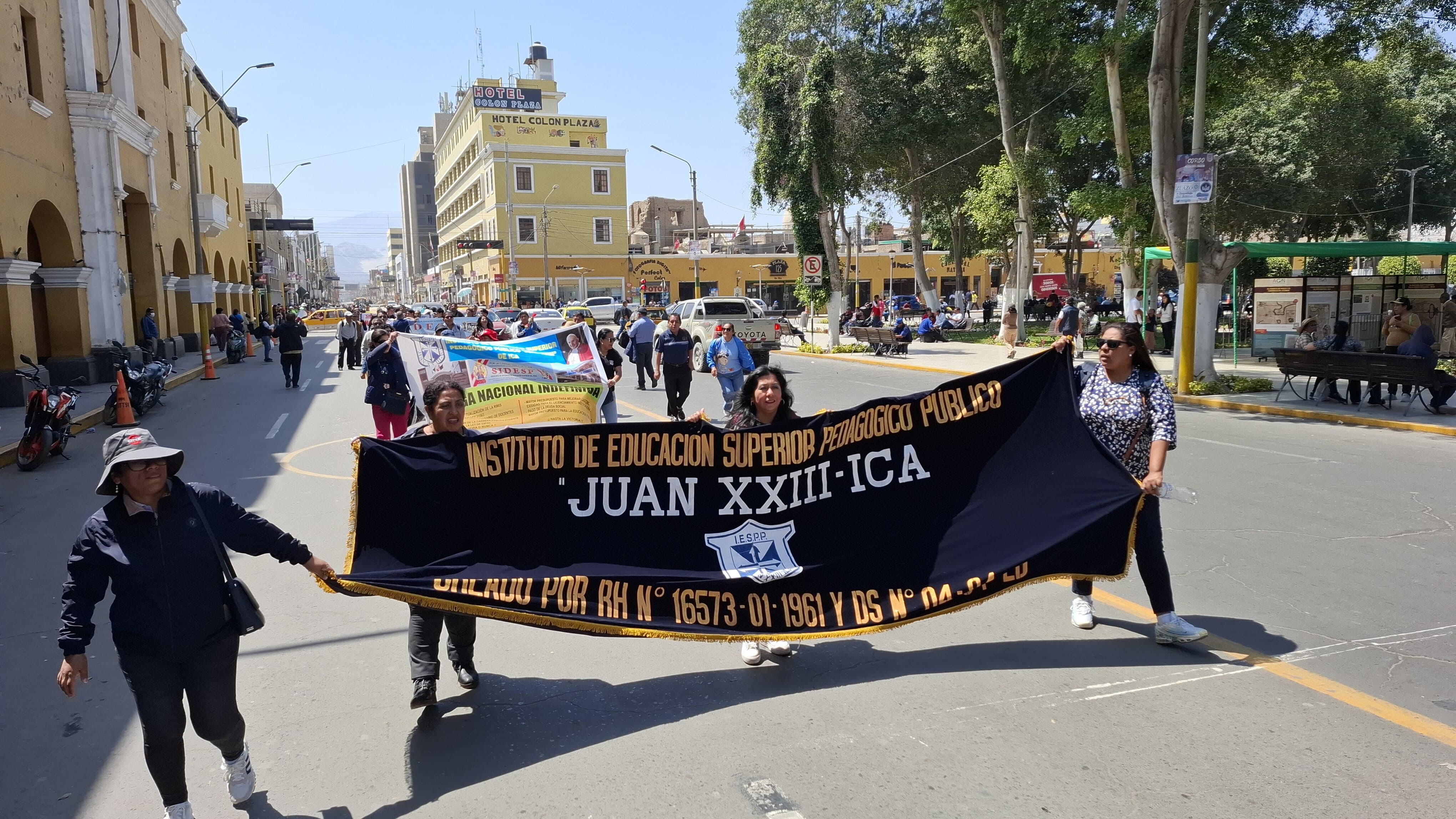 Decenas de docentes de distintos institutos superiores en la provincia de Ica, continúan en la huelga nacional indefinida como lucha por su reivindicación laboral. Reclaman incremento salarial y mejoras en la educación superior.