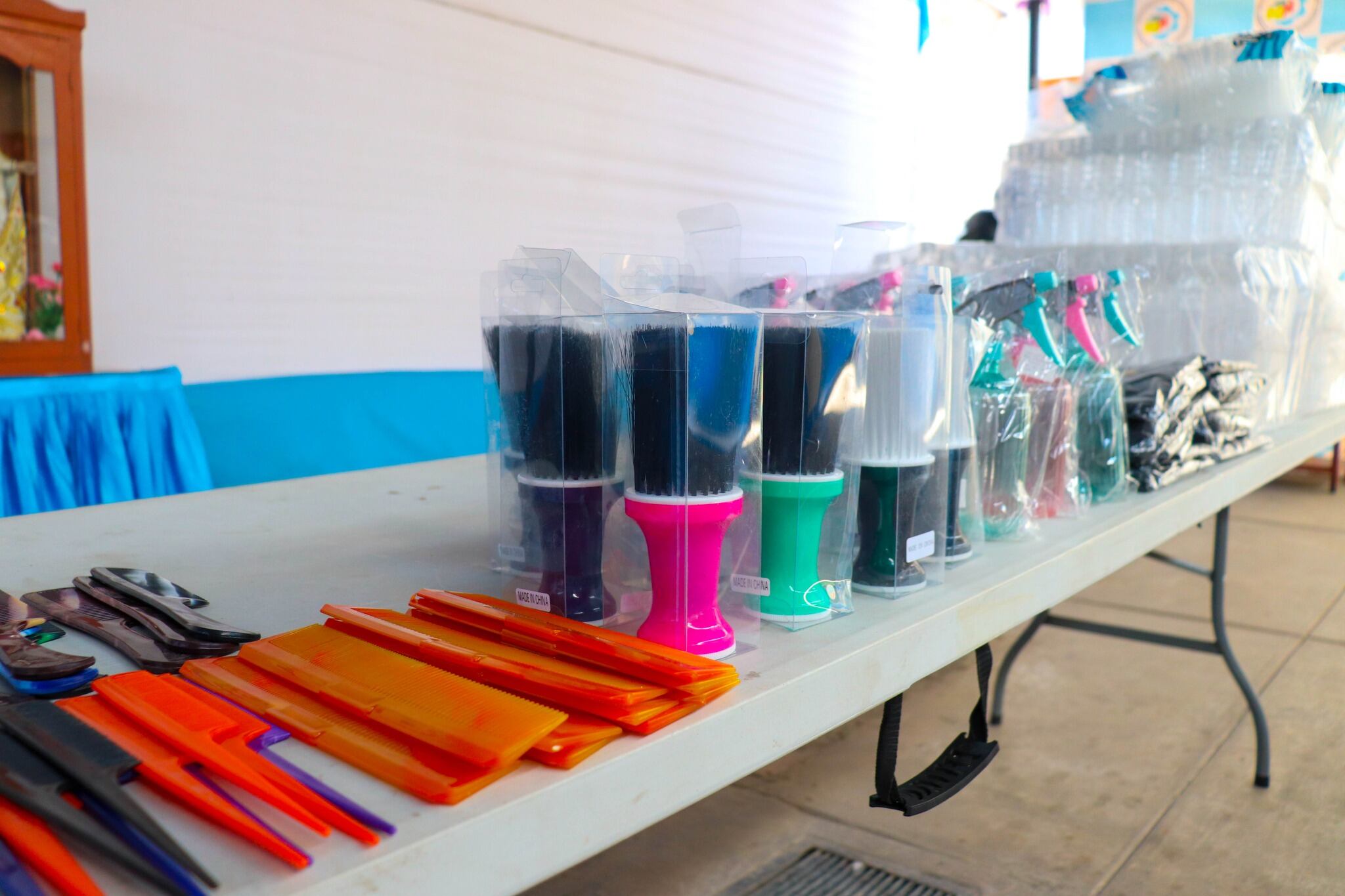 Realizaron la entrega de botellas, envases, mandiles y gorras para el taller de “Elaboración de productos y bebidas”, así como peines, rociadores pulverizadores, escobillas y capas para el taller de “Peluquería y barbería” en el CETPRO “Nuestra Señora de las Mercedes”.