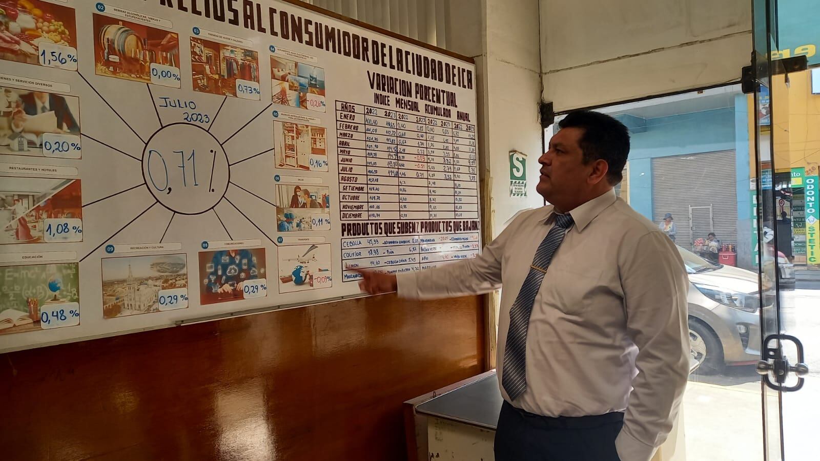 El director departamental del INEI Ica, Martín Paredes, explicó que mientras que en mayo del 2023, el IPC en Ica registró un descenso del -0.03 % y la tendencia a la baja continuó en junio con -0.51 %, en julio del año actual el IPC se elevó con un registró de 0.71 %, además la variación acumulada en lo que va del año llegó al 3.52 % y la variación anualizada alcanzó el 7.55 %.