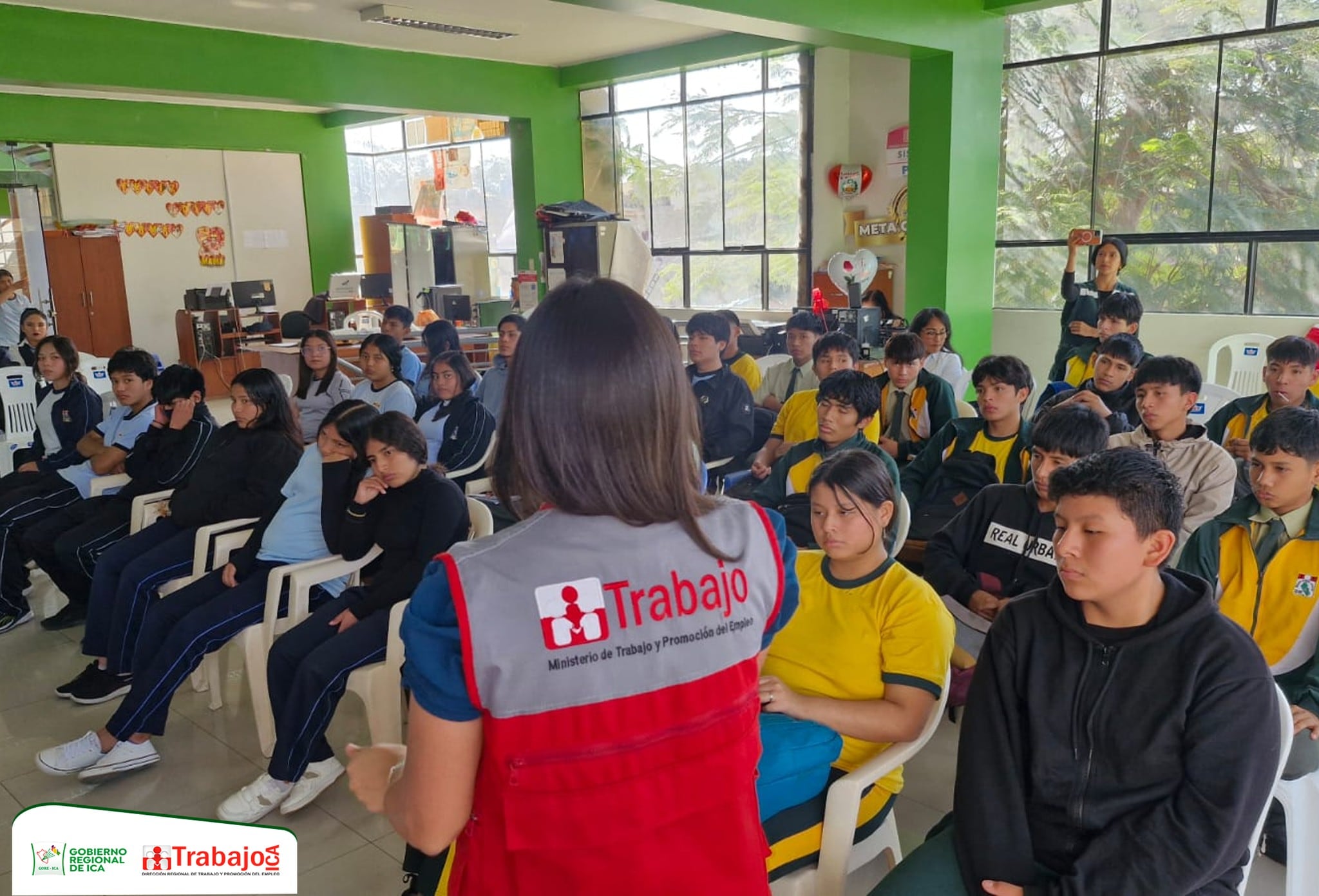 Con el objetivo de brindar herramientas que permitan a los jóvenes tomar decisiones acertadas sobre su futuro profesional, el Gobierno Regional de Ica, a través de la Dirección Regional de Trabajo y Promoción del Empleo (DRTPE), realizó una jornada de orientación vocacional dirigida a estudiantes de quinto grado de secundaria de las instituciones educativas Genaro Huamán Acuache y El Carmen, en el distrito de San Juan Bautista.