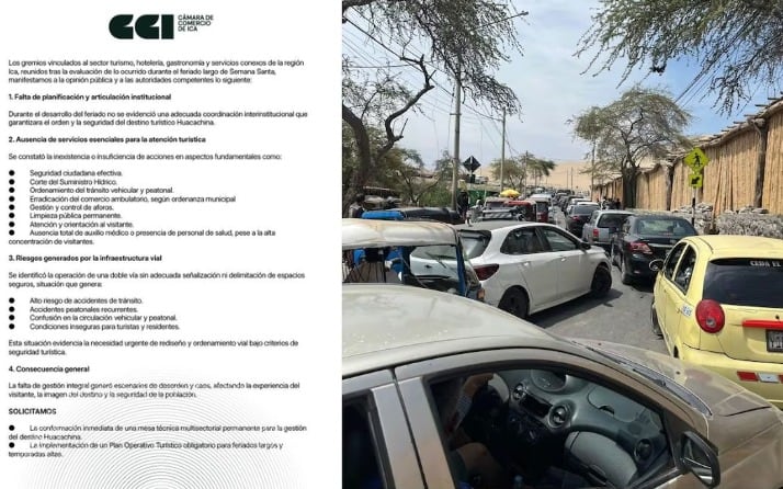 Los gremios empresariales y turísticos de la región Ica difundieron un pronunciamiento conjunto en el que alertaron sobre la crítica situación registrada en Huacachina durante el feriado de Semana Santa.