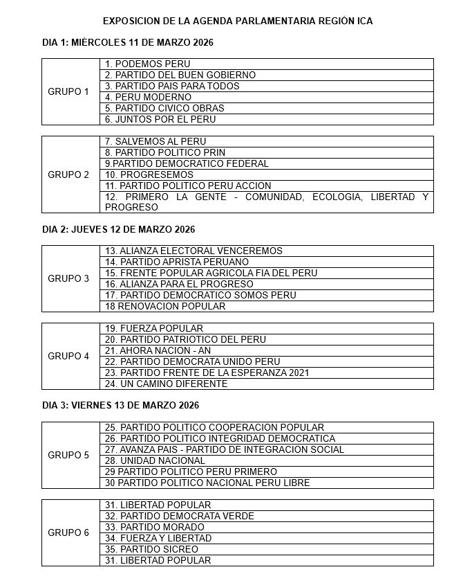 Con el objetivo de que la ciudadanía conozca las propuestas de quienes aspiran a representar al país en el Congreso bicameral, el Jurado Nacional de Elecciones (JNE), a través de su Dirección Nacional de Educación y Formación Cívica Ciudadana y del Programa Voto Informado, organiza la Exposición de Agenda Parlamentaria – Ica que se desarrollará del 11 al 13 en el auditorio central del Hotel Sol de Ica a las 06:00 p.m. y será transmitida a través de la plataforma digital.