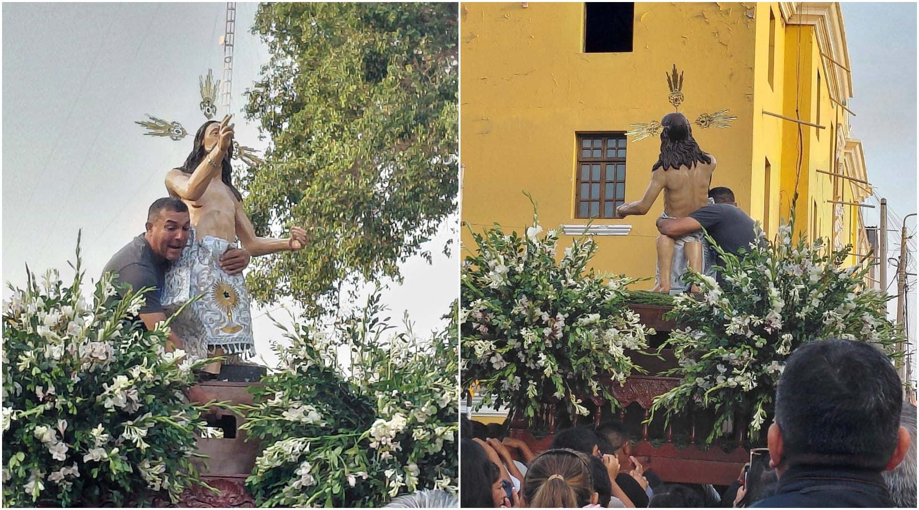 Tras el hecho, los organizadores de la procesión actuaron con rápidez y, en cuestión de minutos, lograron reposicionar la imagen para continuar con el recorrido previsto en la provincia de Ica.