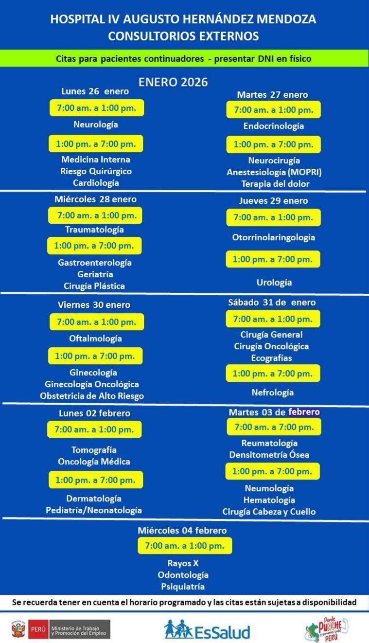 El Hospital IV Augusto Hernández Mendoza inició desde el lunes 26 de enero el proceso de agendamiento de citas médicas para pacientes continuadores con referencia, como parte de la atención regular en consultorios externos.