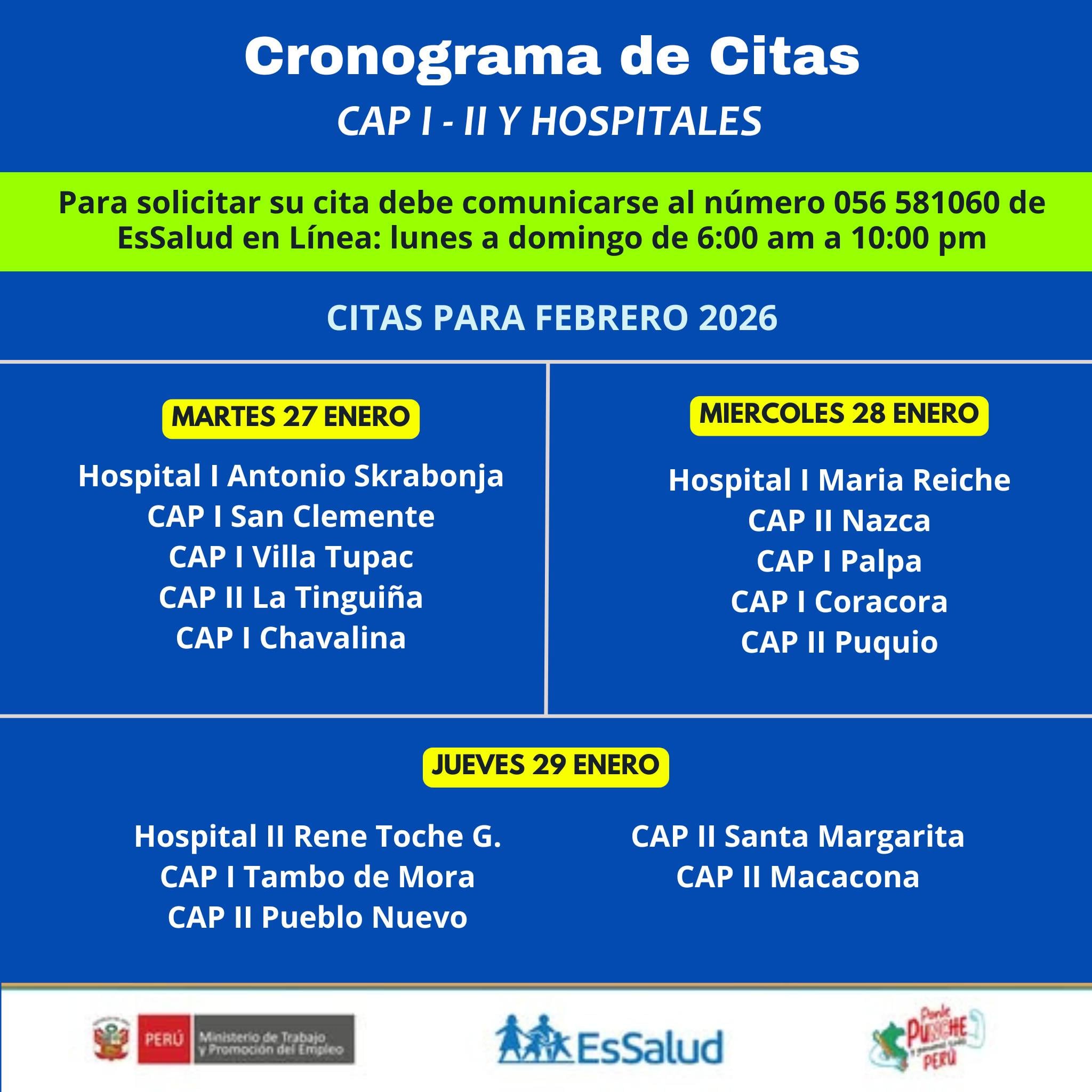 De manera paralela, la Red Asistencial EsSalud Ica informó que desde el martes 27 de enero se viene realizando también el agendamiento de citas médicas para consultorios externos de los Centros de Atención Primaria (CAP I y II), así como de los hospitales ubicados en Pisco, Chincha y Marcona. Este proceso se desarrolla a través del servicio telefónico EsSalud en Línea, al número (056) 581060, el cual se encuentra disponible de lunes a domingo, en el horario de 6:00 de la mañana a 10:00 de la noche.