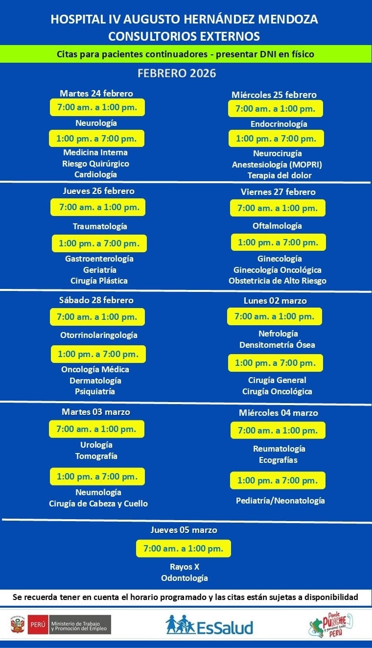 La Red Asistencial Ica de EsSalud informó que desde el martes 24 de febrero se inició el agendamiento de citas médicas para pacientes continuadores con referencia en el Hospital IV Augusto Hernández Mendoza.