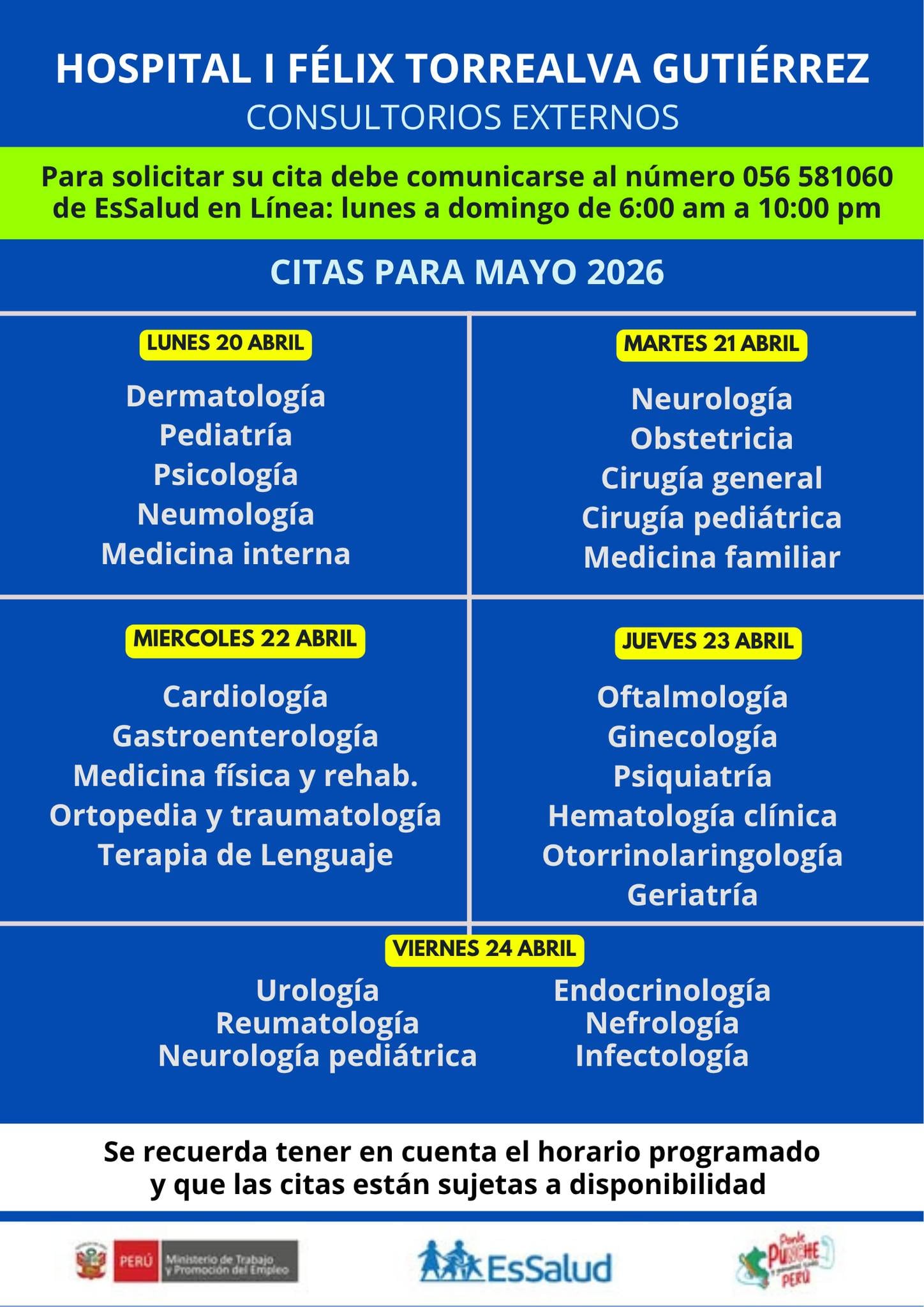 La Red Asistencial Ica de EsSalud informó que a partir del lunes 20 de abril se dará inicio a la programación de citas para consulta externa correspondientes al mes de mayo de 2026 en el Hospital Félix Torrealva Gutiérrez, con el objetivo de ordenar la demanda de atenciones y mejorar el acceso de los asegurados a los servicios de salud.