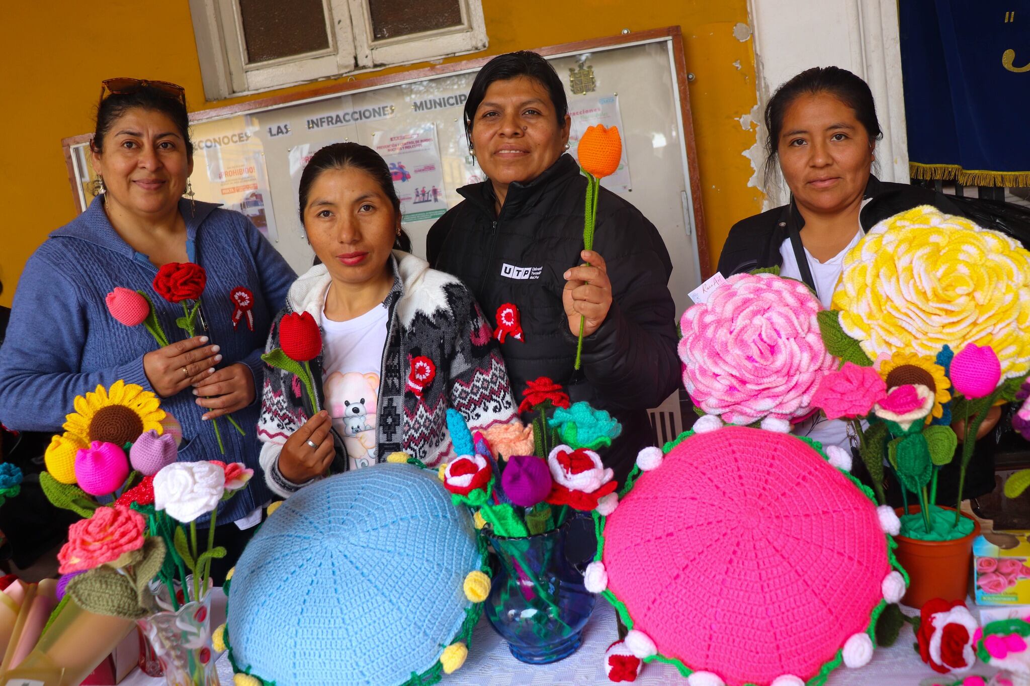 Entre los productos ofrecidos se encuentran tejidos a crochet en forma de girasoles, escarapelas y almohadas, vendidos a precios accesibles, como S/15. También se ofrecen alfajores de maíz, pastel de coco, budín de arándanos, chocotejas, crema volteada, y una variada carta gastronómica que incluye ceviche, papa a la huancaína, carapulcra con sopa seca, causa rellena y ají de gallina.