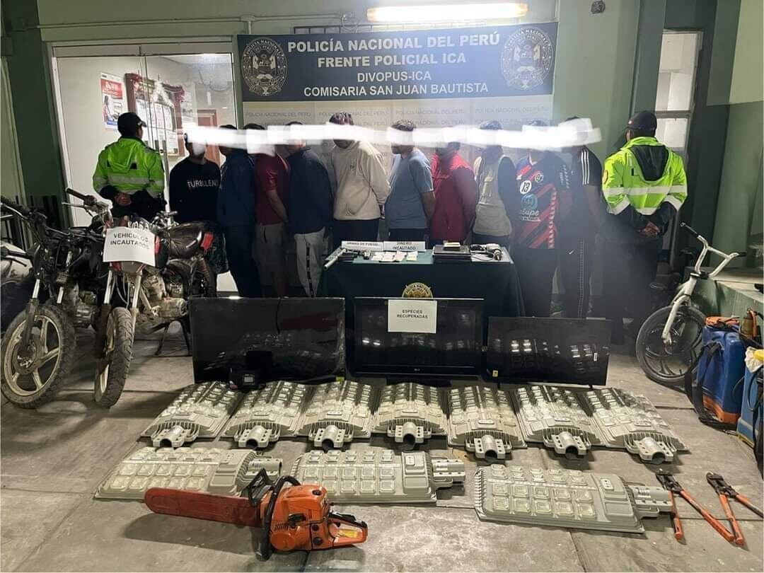 La captura de los presuntos delincuentes se produjo en la Mz. L – 16, caserío El Carmen, donde los sujetos estaban comercializando electrodomésticos de dudosa procedencia, tales como laptops, televisores, paneles solares y celulares. Al notar la presencia policial, intentaron huir por la parte posterior de la vivienda, pero fueron capturados. Entre los detenidos se encuentran: Julio César Gallegos Moreno, alias “Pirula”; Luis Enrique Ramos Herhuay, alias “Costra”; César Rolando Centeno Orellana, alias “Ton”; Jorge Gonzalo Ormeño Ramos, alias “Gata”; Phil Jackson Matta Tipian, alias “Pelada”; Alexsander Jesús Gallegos Quispe, alias “Gallo”; José Luis Chacaliaza Orellana, alias “Makoloco”; Luis Miguel Gallegos Toledo, alias “Cachiche”; Walter Iván Vargas Cajo, alias “Riquelme”; y Roy José Gallegos Ramos, alias “Roy”.