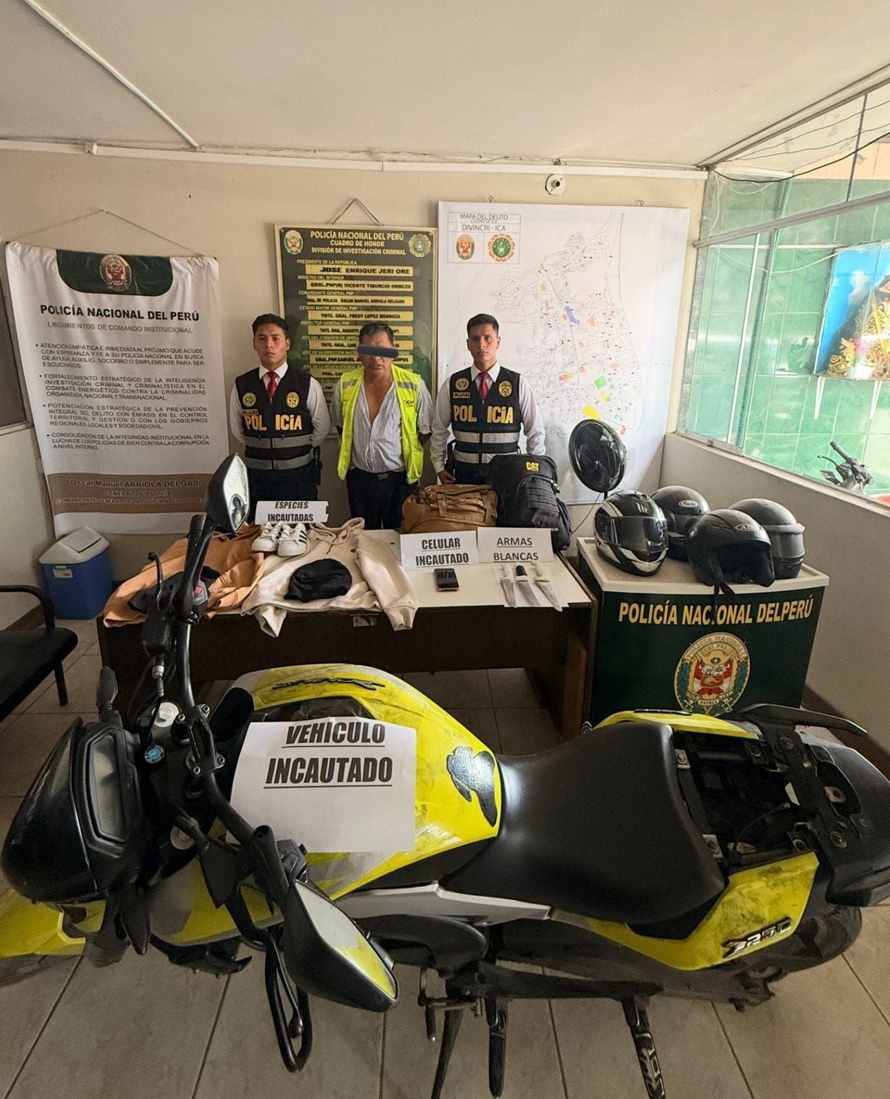 Durante la intervención se procedió a la incautación de la motocicleta marca Bajaj, modelo Dominar 250, color amarillo, placa N.° 2512-MC, vehículo utilizado por los delincuentes. Asimismo, se incautaron prendas de vestir utilizadas por los facinerosos, tres (03) pasamontañas, cuatro (04) cascos de seguridad, tres (03) cuchillos y se logró la recuperación de dos (02) mochilas y prendas de vestir de propiedad del agraviado.