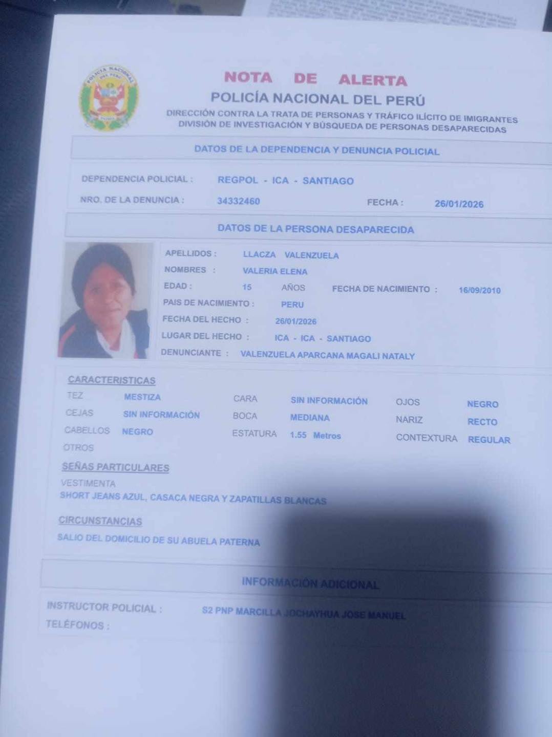 Familiares solicitan el apoyo de la ciudadanía para localizar a Valeria Elena Llacza Valenzuela, una adolescente de 15 años que se encuentra desaparecida desde la mañana del 26 de enero en el distrito de Santiago, en la provincia de Ica.