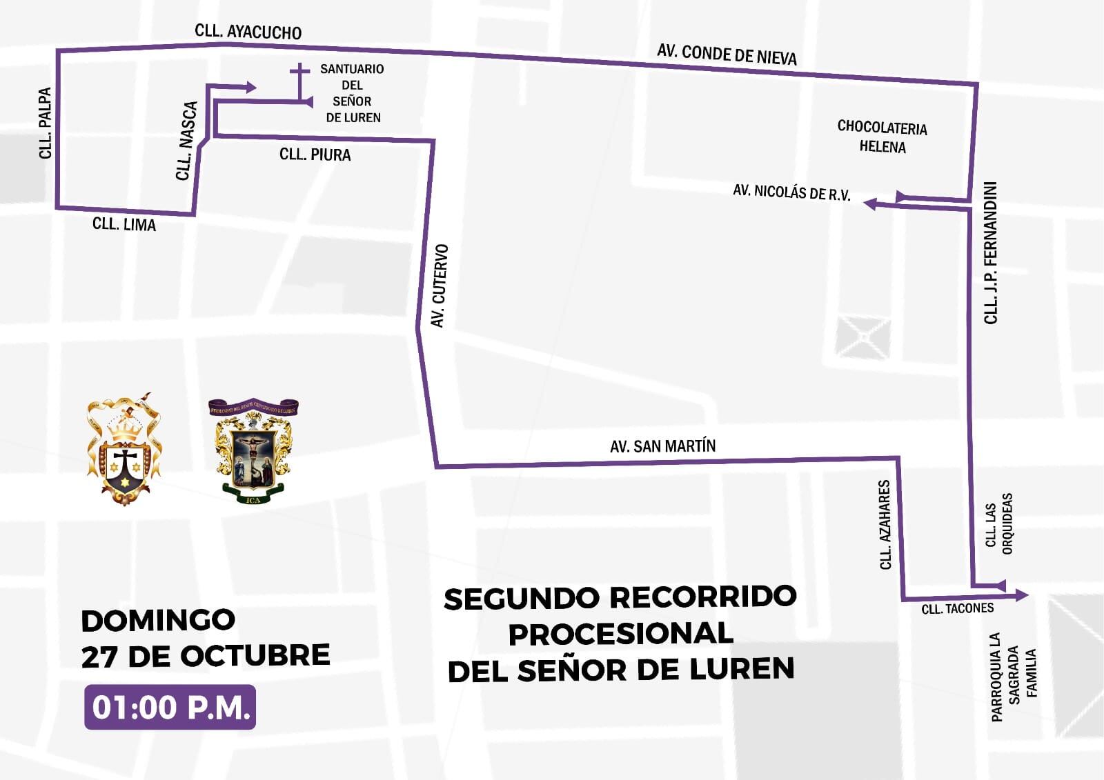 La imagen sagrada seguirá por la avenida Cutervo, av. San Martín, calle Azahares, calle Tacones, calle Orquídeas, calle Juan Pablo Fernandini, av. Conde de Nieva, calle Ayacucho, calle Palpa, calle Lima y terminará por la calle Nasca, para su retorno triunfal e ingreso al santuario a las 9:00 de la noche.