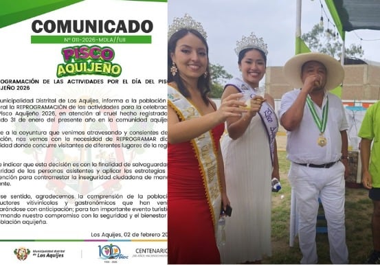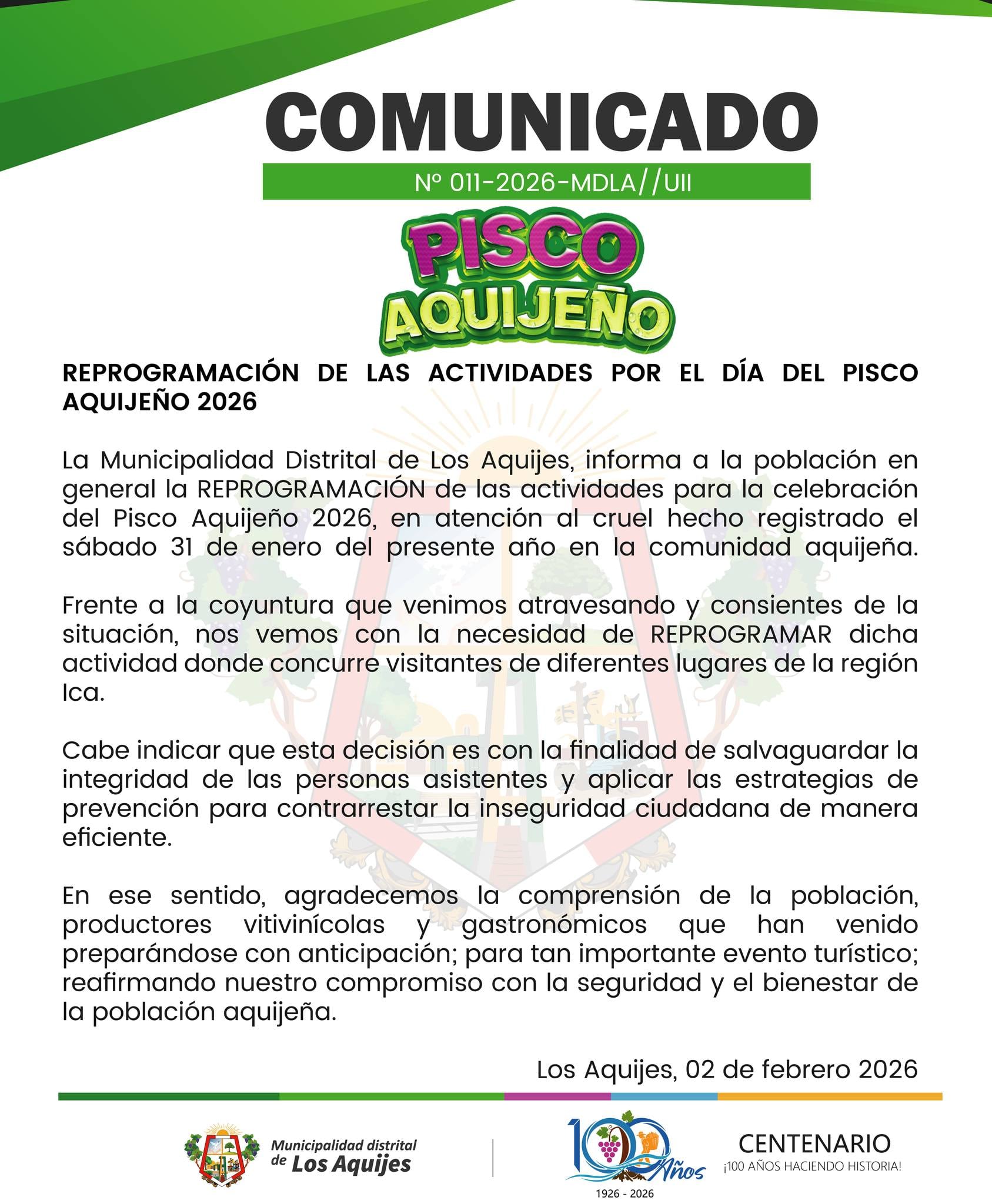 La Municipalidad Distrital de Los Aquijes ha oficializado la reprogramación de todas las actividades conmemorativas por el “Día del Pisco Aquijeño 2026”.