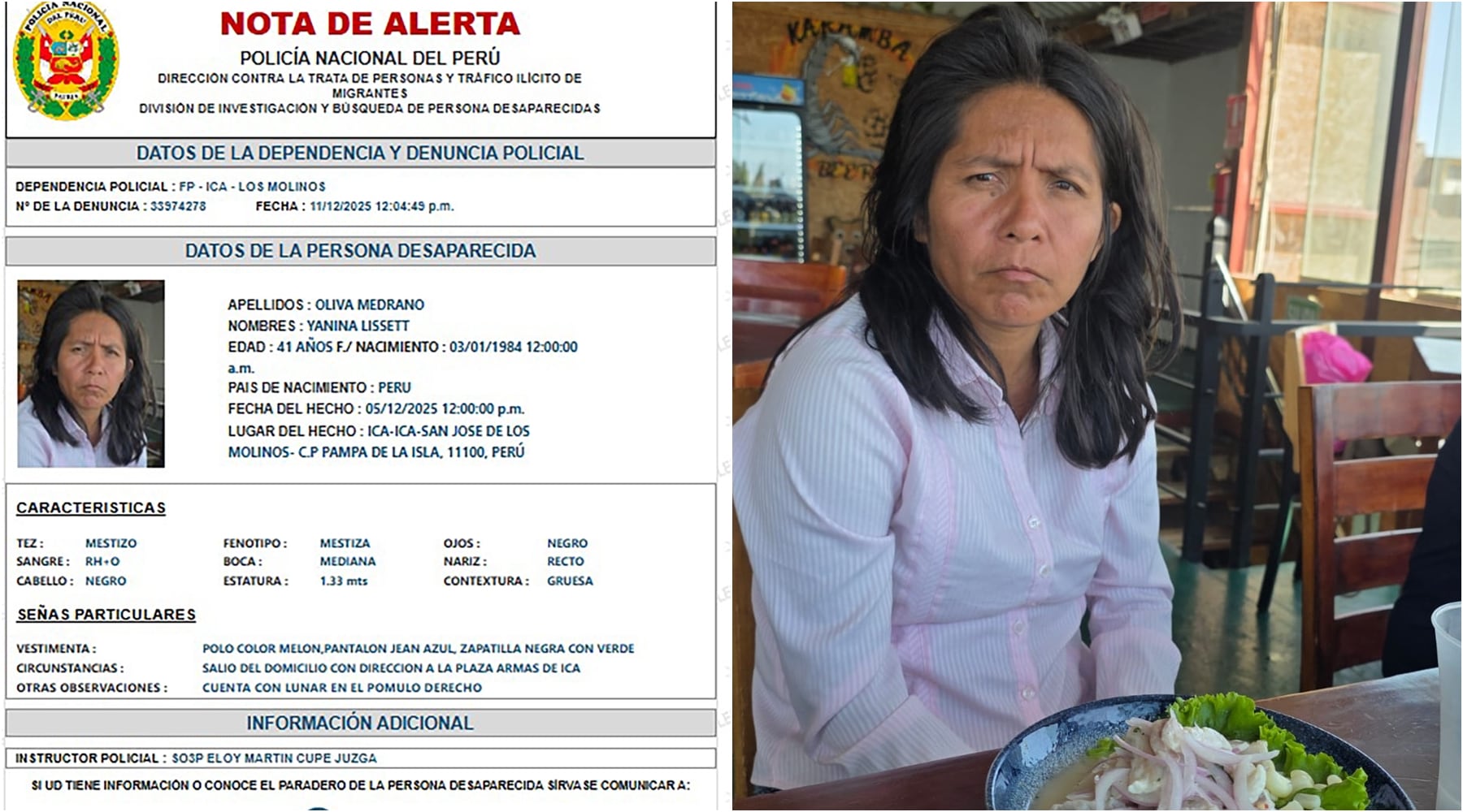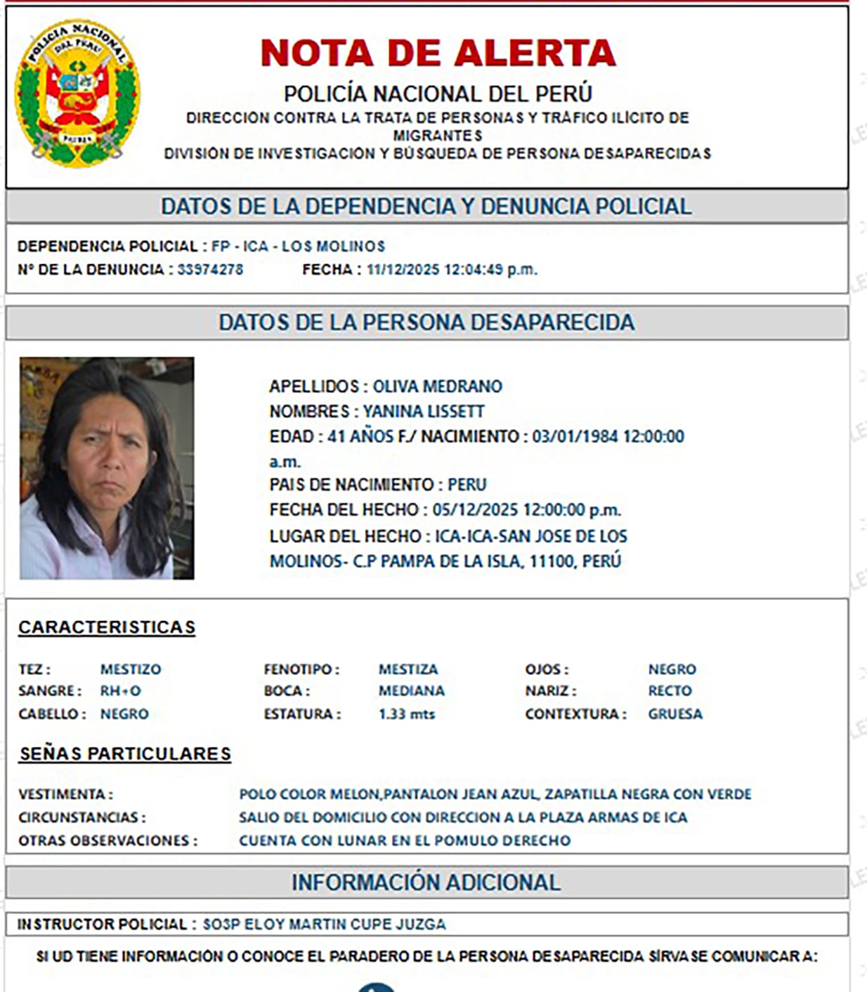De acuerdo con el reporte policial, Yanina fue vista por última vez el 5 de diciembre de 2025, cuando salió de su vivienda con destino a la Plaza de Armas de Ica, aproximadamente a las 12:00 del mediodía. Desde ese momento, no volvió a comunicarse ni regresó a su hogar.