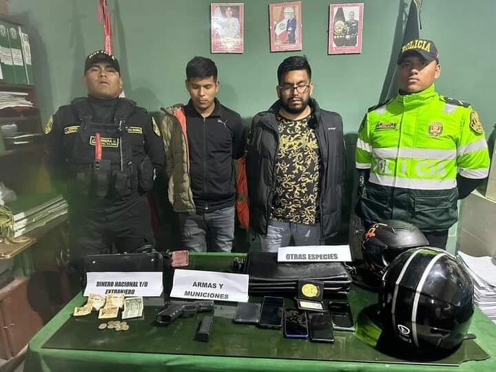 En el lugar también se incautó el vehículo automóvil mayor color blanco, Kía, sin placa frontal y con placa posterior BLK-487, un arma de fuego de puño, marca Glock 25, color negro de serie XMG684, abastecida con cinco municiones calibre 380, considerados instrumentos del delito. Los dos sujetos fueron plenamente reconocidos por los agraviados como los autores del ilícito penal. Son investigados por la comisión del presunto delito contra el patrimonio en su modalidad de robo agravado en banda y otros.