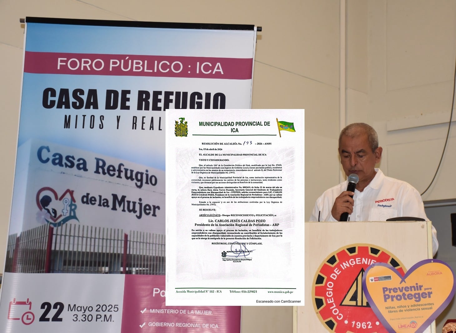 La Municipalidad Provincial de Ica emitió la Resolución de Alcaldía N.° 193-2026-AMPI, mediante la cual se otorga un reconocimiento y felicitación al licenciado Carlos Jesús Caldas Pozo, presidente de la Asociación Regional de Periodistas del Perú (ARPP), en mérito a su contribución a iniciativas orientadas a la inclusión social y el fortalecimiento de poblaciones vulnerables en la región.