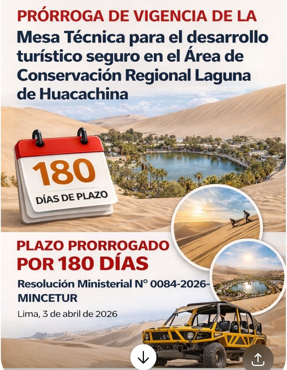 Mediante la Resolución Ministerial Nº 0084-2026-MINCETUR, se ha prorrogado el plazo de vigencia del Grupo de Trabajo Multisectorial denominado “Mesa Técnica para el desarrollo turístico seguro en el ámbito del Área de Conservación Regional Laguna de Huacachina” por 180 días calendario, a partir del 6 de abril de 2026.