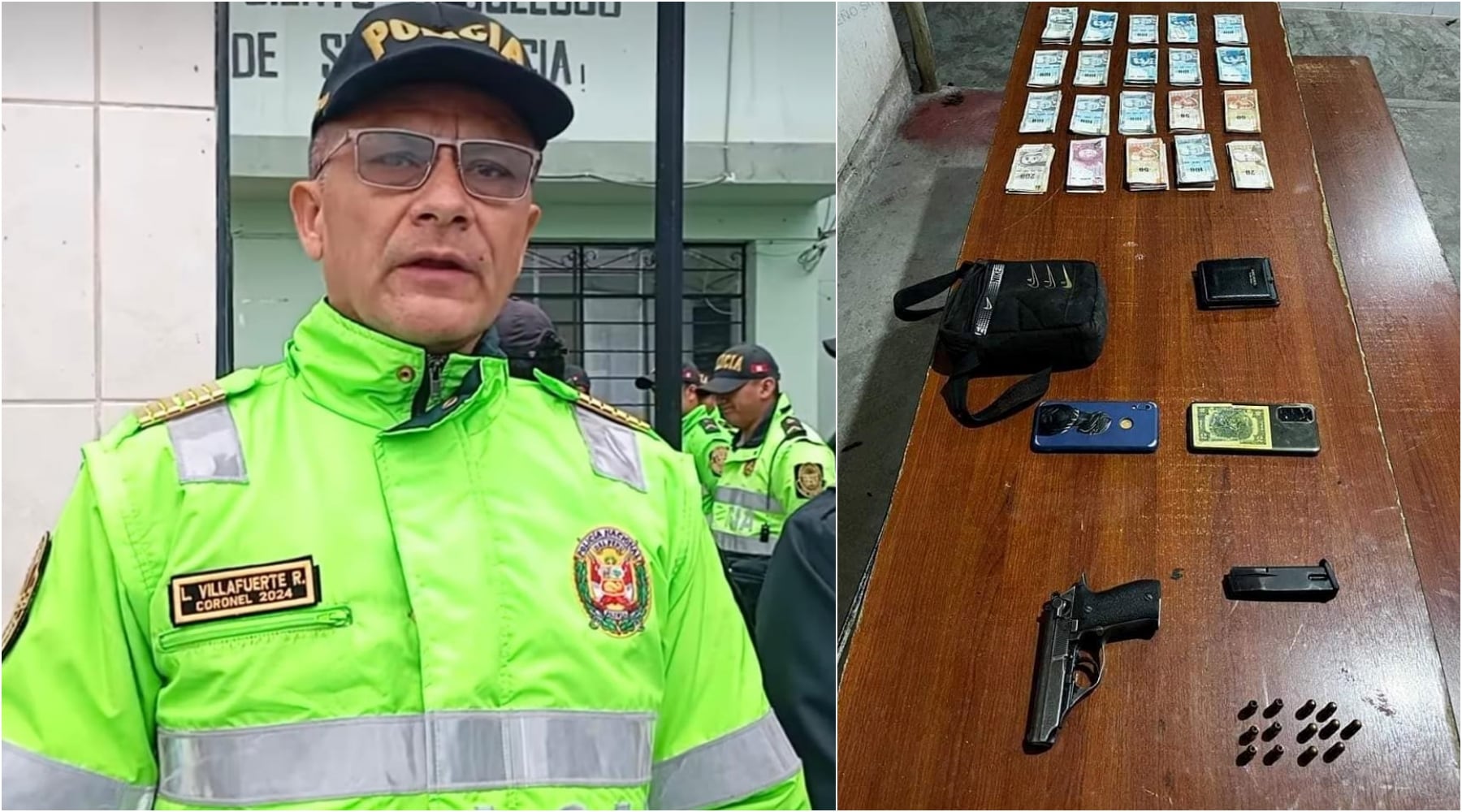 “El comerciante es interceptado a las 8:40 de la noche y despojado de 19 mil soles y hay que destacar la acción rápida del patrullaje que de forma estratégica pudieron advertir el delito, desplegaron sus unidades móviles y lograron intervenir al delincuente luego de una persecución. Iban a bordo de dos motocicletas y uno de ellos fue reducido, y se le encontró en sus pertenencias los 19 mil soles, una pistola de 9 milímetros, y estos delincuentes tiene un perfil compatible a una organización del Tren de Aragua. La información que el comerciante tenía cantidad de dinero hay alguien que la ha tenido que trasladar a estos delincuentes que operan de forma organizada”, declaró el coronel PNP Luggui Villafuerte Rivero, jefe de la División Policial de Orden y Seguridad Ica.