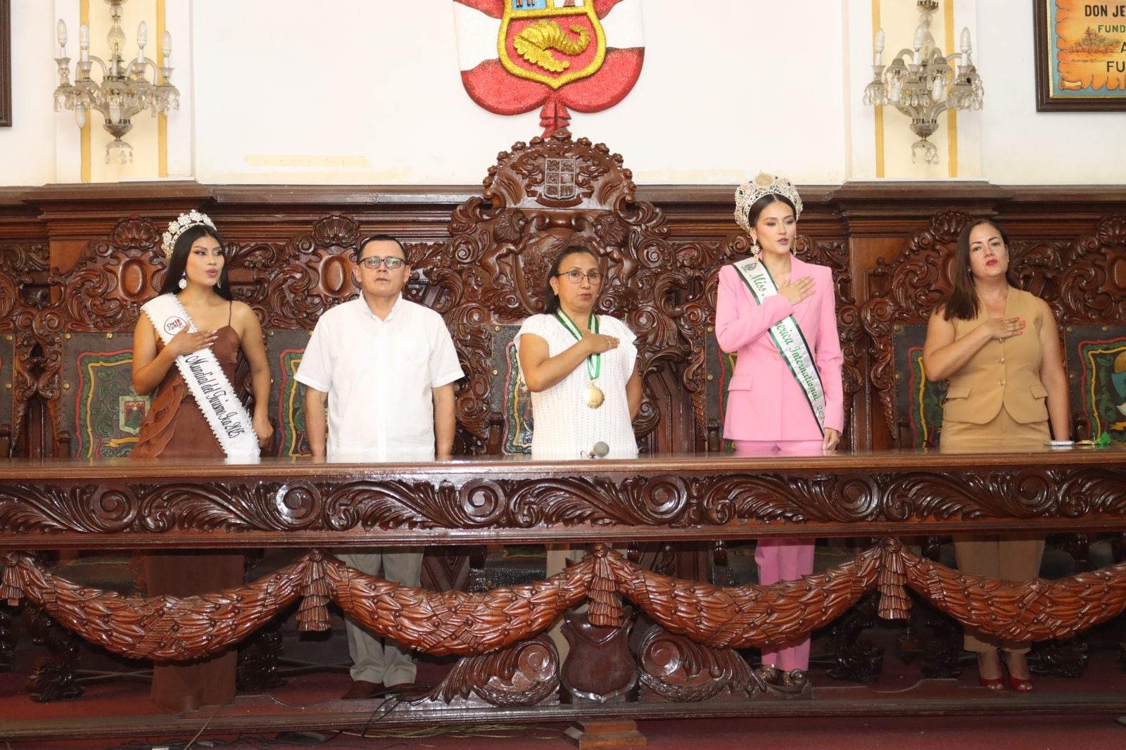 Durante su intervención, la reina de belleza destacó la importancia del certamen en el que participó y agradeció el reconocimiento recibido por parte de la comuna iqueña. “Acabo de concursar y ganar en el certamen Mesoamérica Internacional que se realizó en El Salvador. Es uno de los concursos más culturales del mundo”, señaló.