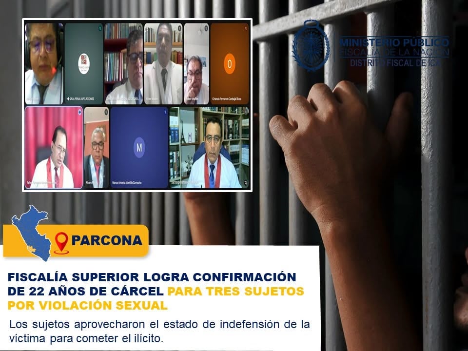 Una severa condena quedó firme en Ica luego de que la Segunda Fiscalía Superior Penal Transitoria de Chincha lograra la confirmación de 22 años de pena privativa de la libertad efectiva contra tres hombres hallados responsables de un delito contra la libertad sexual en agravio de una joven de 21 años.