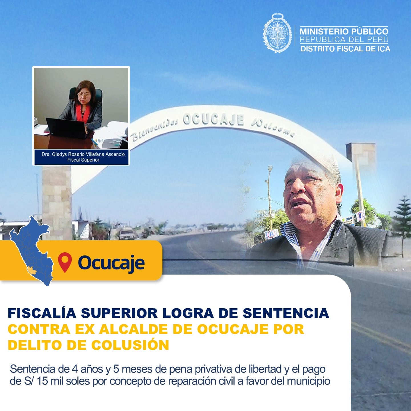 La Segunda Fiscalía Superior Penal Transitoria de Chincha a cargo Gladys Rosario Villafana Ascencio, logró la sentencia de 4 años y 5 meses de pena privativa de libertad contra Luis Aldo Guevara Uchuya, ex alcalde de Ocucaje, como autor del delito contra la administración pública en la modalidad de colusión en agravio de la Municipalidad Distrital de Ocucaje.