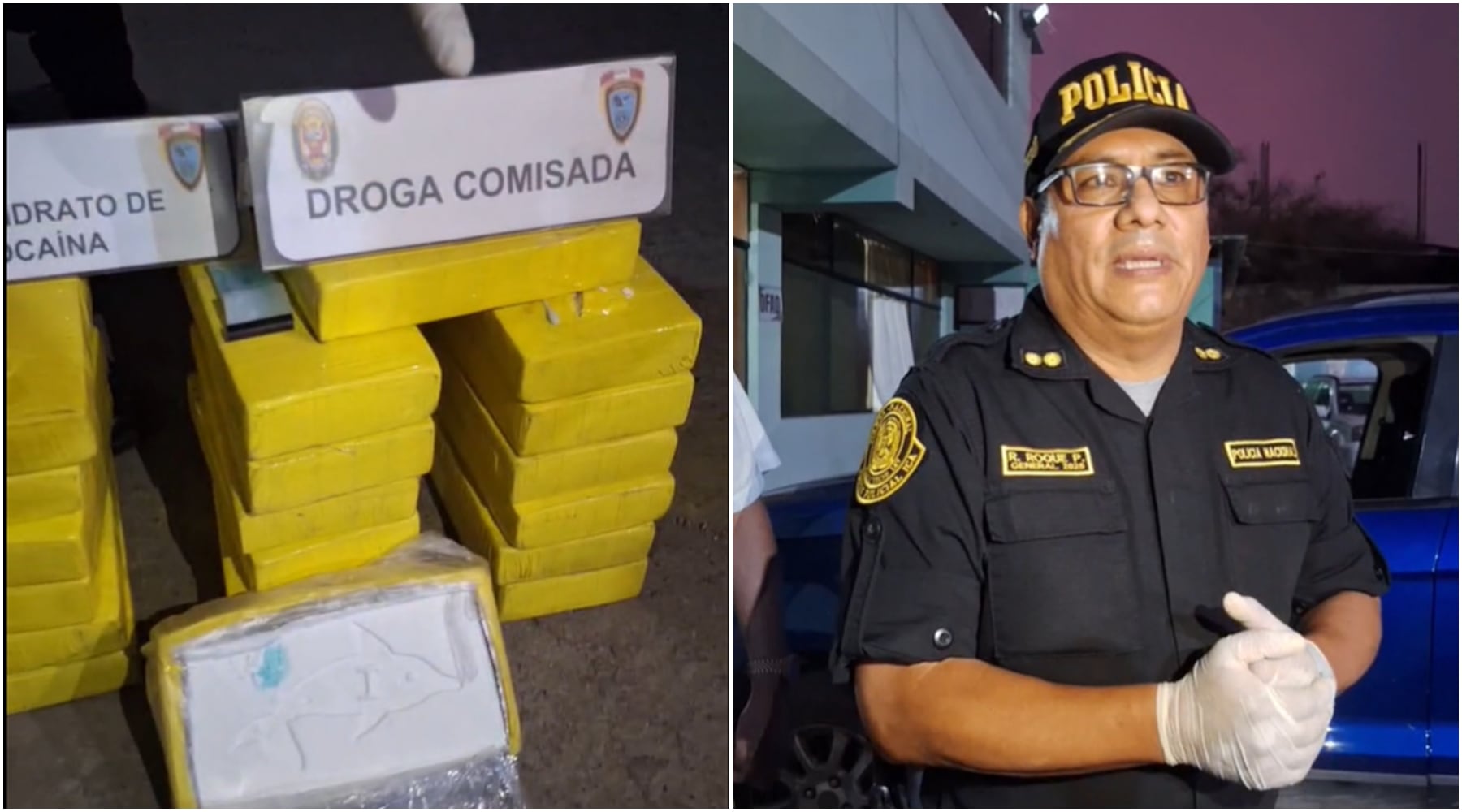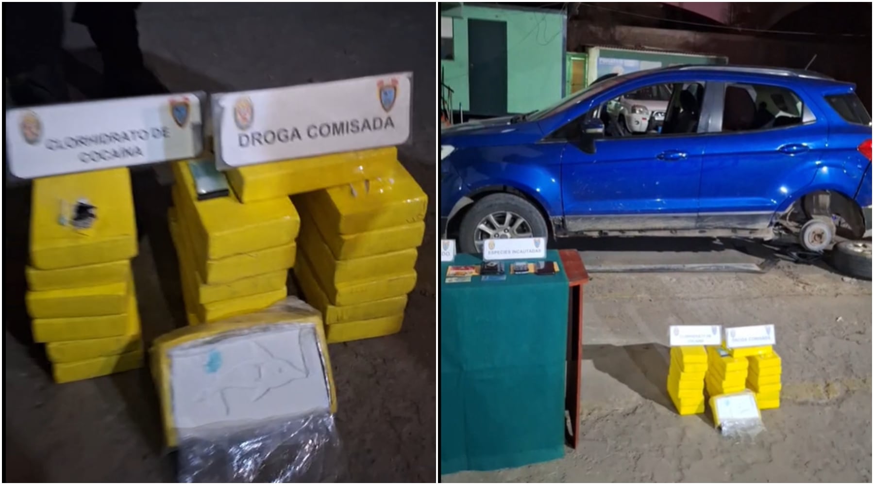 “Se encontró 21 ladrillos precintados de color amarillo, que al ser revisados minuciosamente se pudo observar que contenían una sustancia blanquecina compacta, la misma que al ser sometida a prueba de campo, arrojó un presuntivo indicativo para clorhidrato de cocaína. Asimismo, se pudo intervenir dos equipos celulares, los mismos que se estarán formulando la respectiva cadena de custodia para las pericias y análisis correspondientes”, indicó el General.