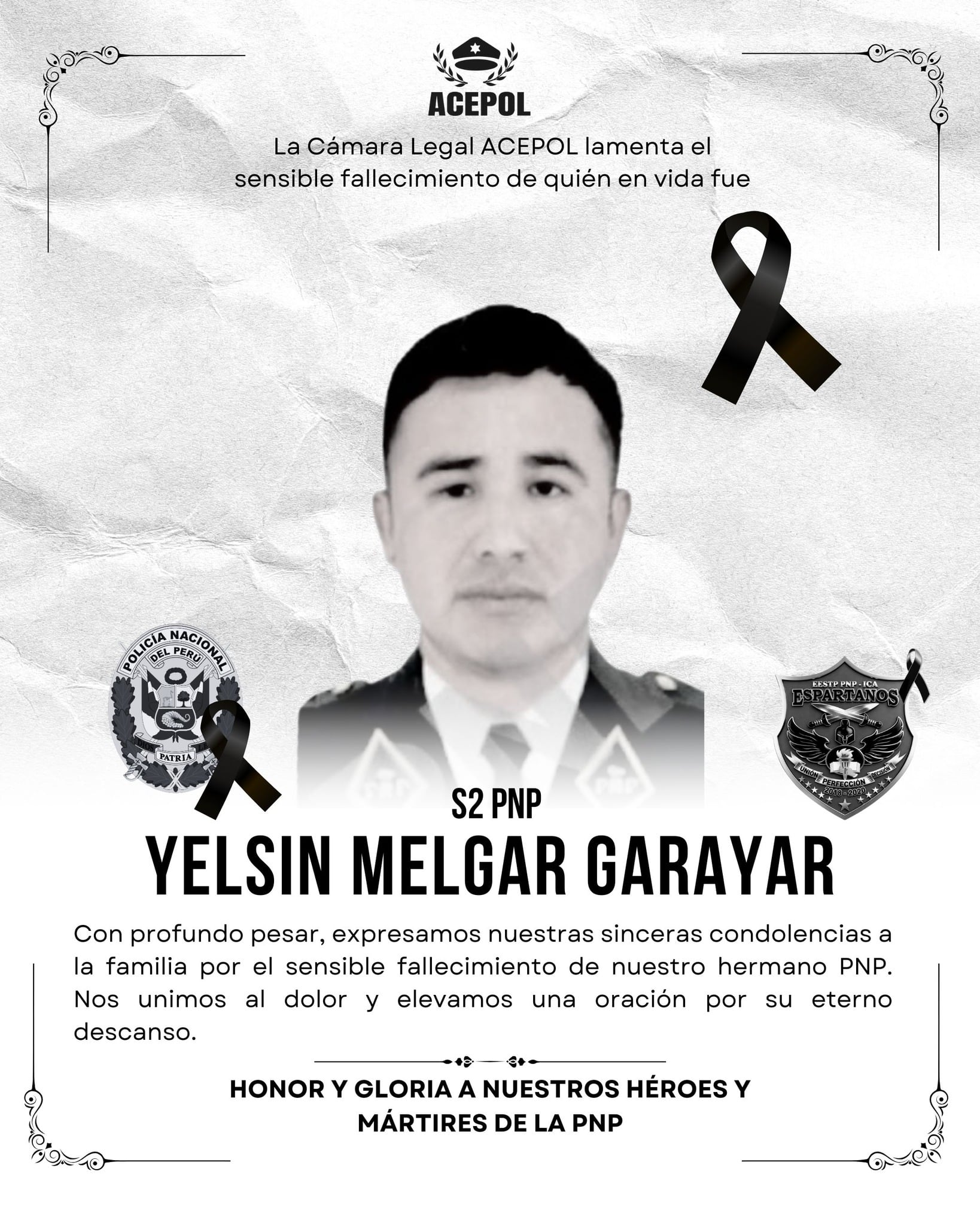 “Desde ACEPOL expresamos nuestras más sinceras condolencias por el sensible fallecimiento del S2 Yelsin Melgar Garayar. Nos unimos al dolor de su familia, amigos y compañeros de armas, elevando una oración por su eterno descanso y fortaleza para sus seres queridos en estos momentos difíciles”, se indicó en el mensaje difundido.