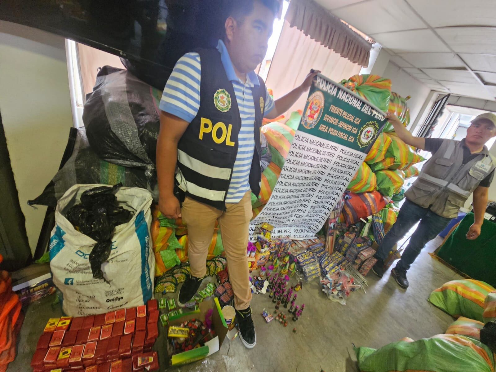 Los operativos de incautación de productos pirotécnicos continúan. Esta vez la policía fiscal, en conjunto con Sucamec Ica, se desplazaron hasta distintas calles y avenidas de la ciudad de Ica, también en los distritos de La Tinguiña y Parcona, donde incautaron más de 70 kilos de pirotécnicos.